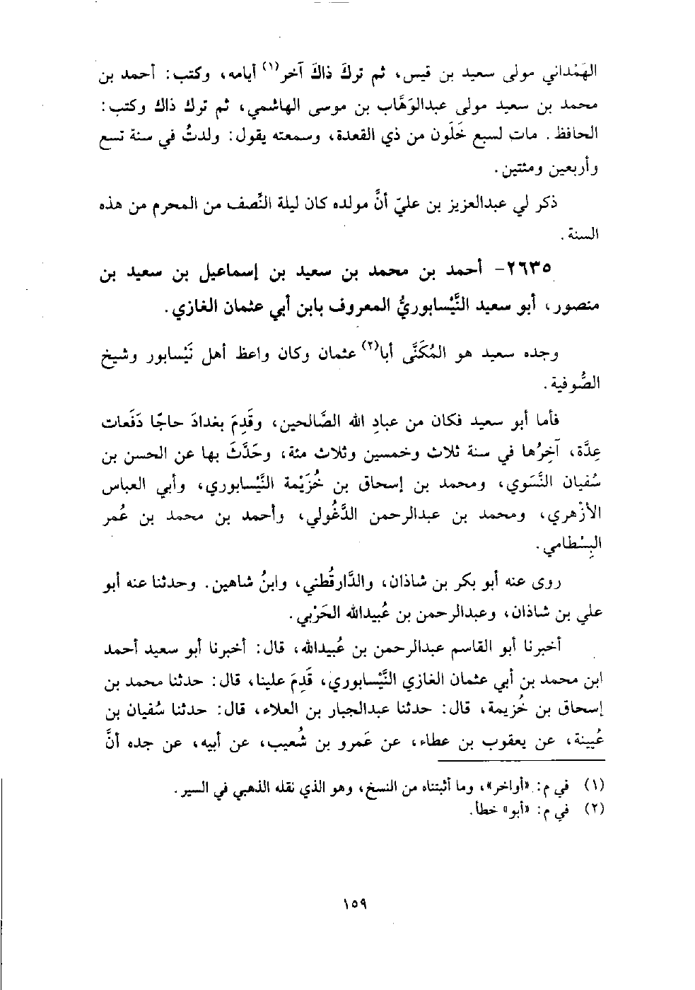 2635 - أَحْمَد بْن مُحَمَّد بْن سعيد بْن إسماعيل بْن سعيد بْن منصور أَبُو سعيد النيسابوري المعروف بابن أَبِي عثمان الغازي وجده سعيد هو المكنى أَبا عثمان وكَانَ واعظ أهل نيسابور وشيخ الصوفِية.