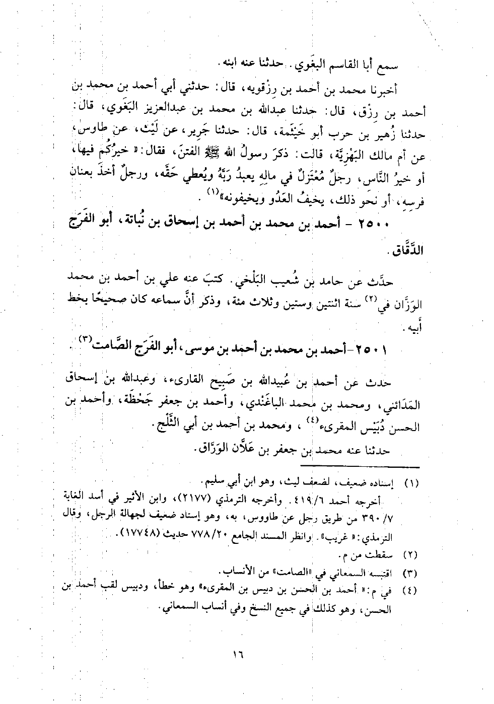 2500 - أَحْمَد بْن مُحَمَّد بْن أَحْمَد بْن إسحاق بْن نباته أَبُو الفرج الدقاق حدث عَن حامد بْن شعيب البلخي، كتب عنه علي بْن أَحْمَد بْن مُحَمَّد الوزان في سنة اثنتين وستين وثلاث مائة، وذكر أن سماعه كَانَ صحيحا بخط أَبِيهِ