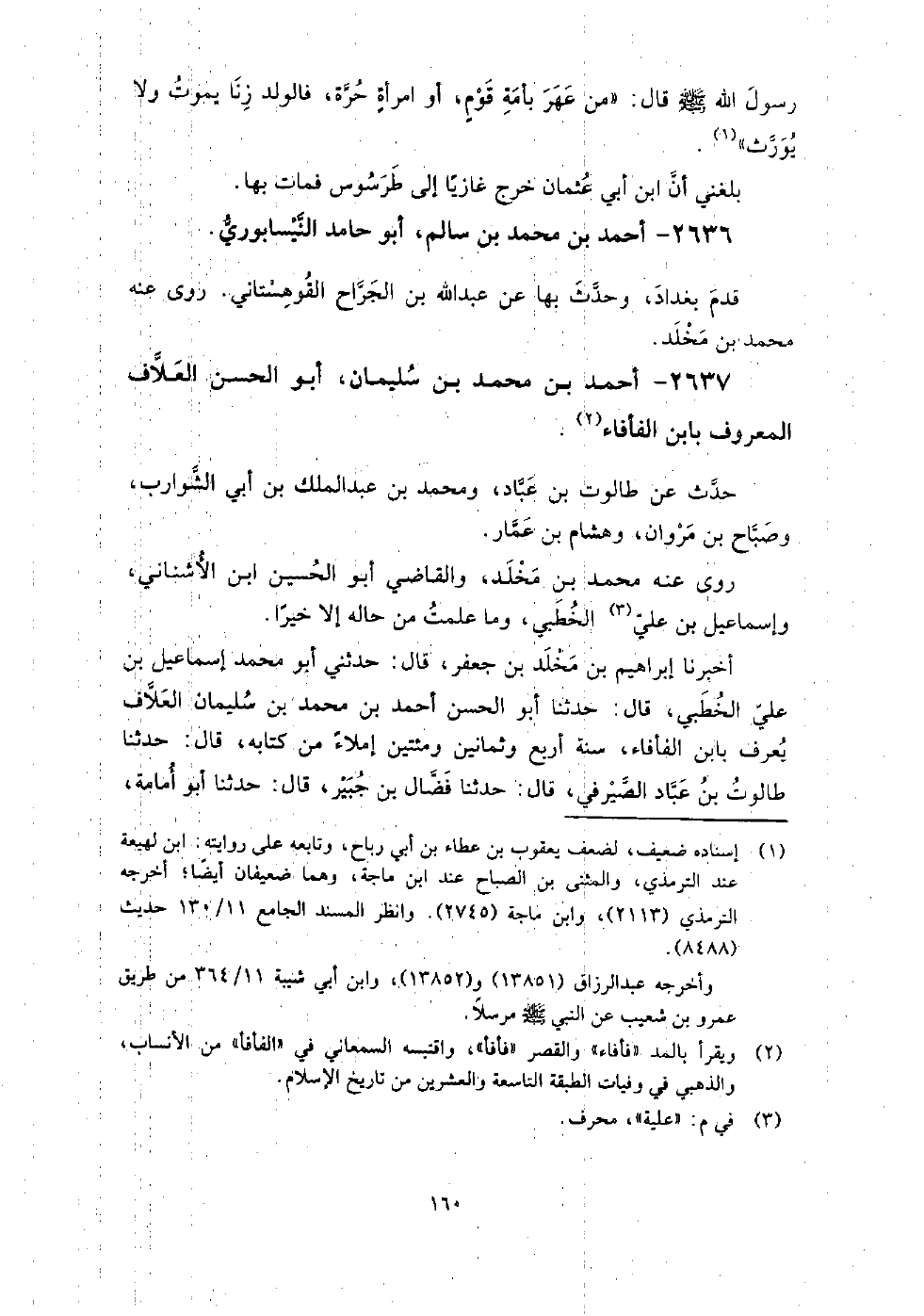 2637 - أَحْمَد بْن مُحَمَّد بْن سليمان أَبُو الحسن العلاف المعروف بابن الفأفاء حدث عَن طالوت بْن عباد، ومحمد بْن عَبْد الملك بْن أَبِي الشوارب، وصباح بن مروان، وهشام بن عمار.