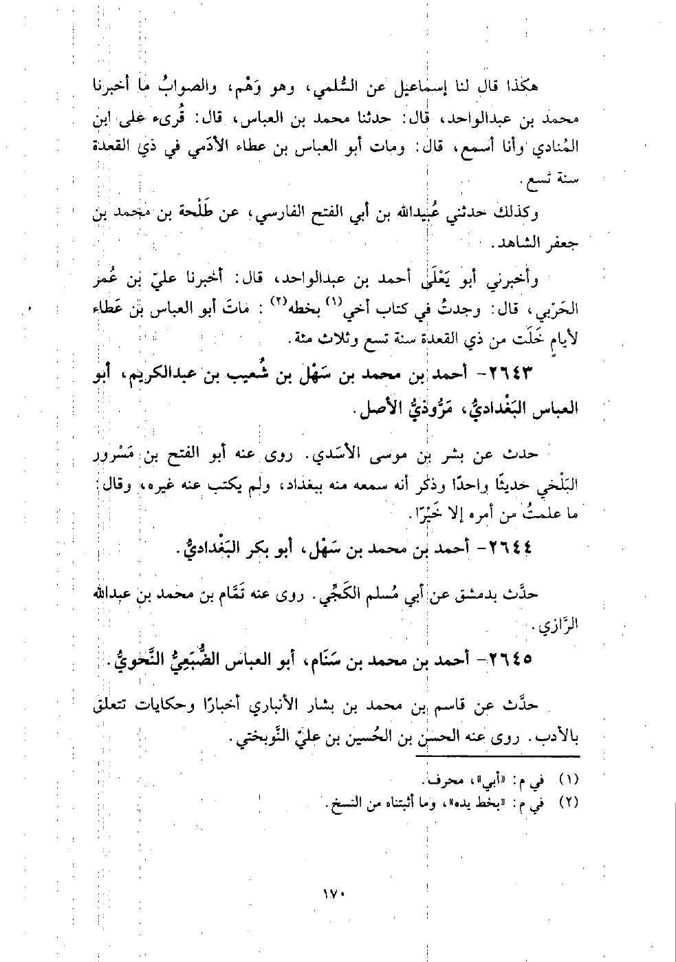 2645 - أَحْمَد بْن مُحَمَّد بْن سنام أَبُو العباس الضبعي النحوي حدث عَن قاسم بْن مُحَمَّد بْن بشار الأنباري أخبارا وحكايات تتعلق بالأدب، روى عنه الحسن بْن الحسين بْن علي النوبختي.