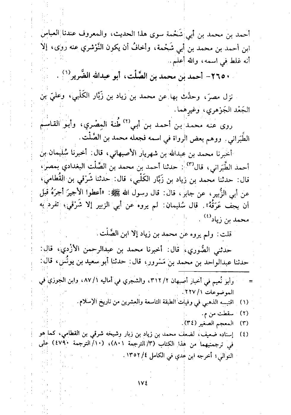 2650 - أَحْمَد بْن مُحَمَّد بْن الصلت أَبُو عَبْد اللَّه الضرير نزل مصر، وحدث بها عَن مُحَمَّد بْن زياد بْن زبار الكلبي، وعلي بْن الجعد الجوهري، وغيرهما.