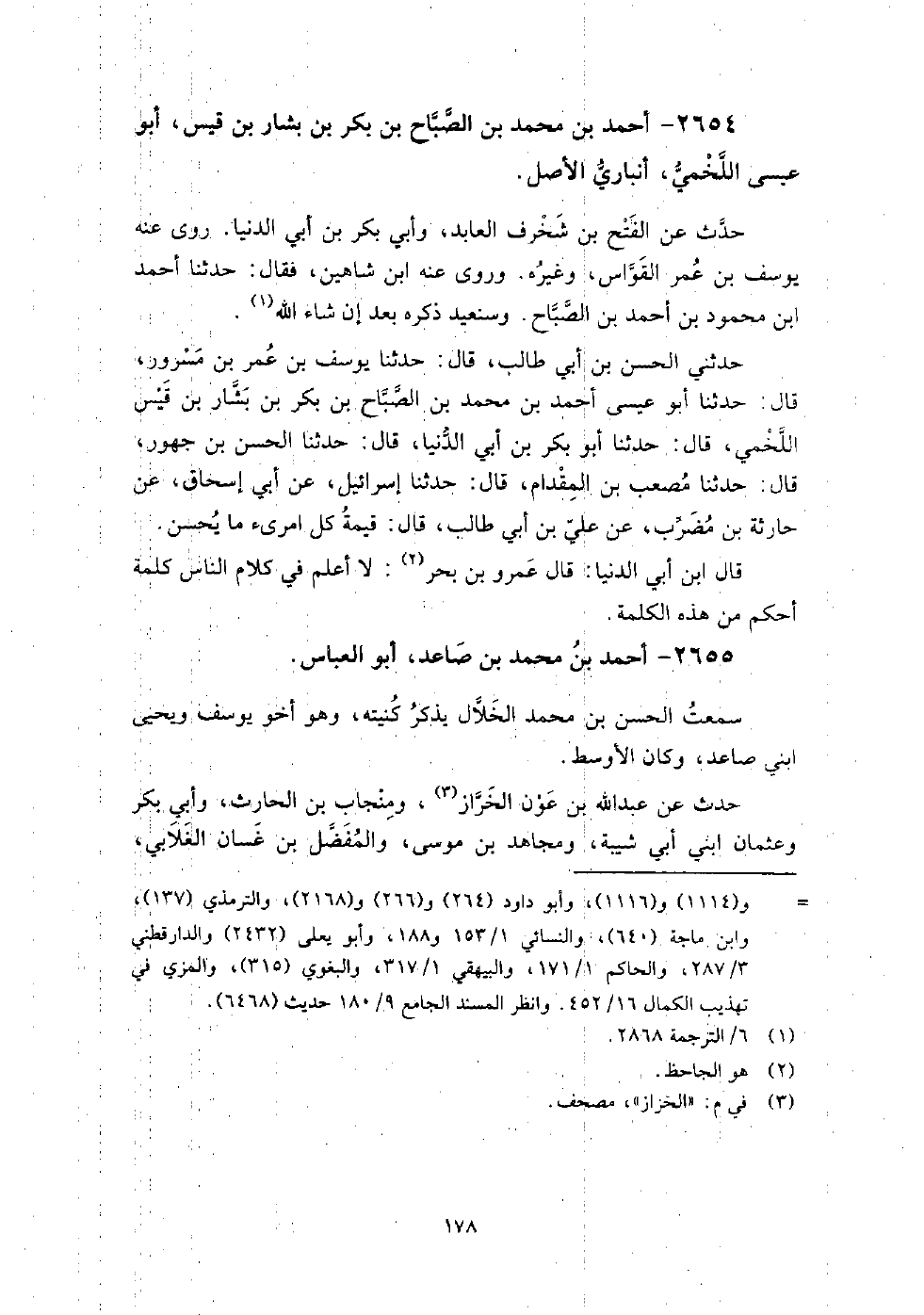 2654 - أَحْمَد بْن مُحَمَّد بْن الصباح بْن بكر بْن بشار بْن قيس أَبُو عيسى اللخمي أنباري الأصل حدث عَنِ الفتح بْن شخرف العابد، وأبي بكر بْن أَبِي الدُّنْيَا، روى عنه: يوسف بْن عمر القواس، وغيره، وروى عنه: ابْن شاهين، فقال: حَدَّثَنَا أَحْمَد بْن محمود بْن أَحْمَد بْن الصباح، وسنعيد ذكره بعد إن شاء اللَّه.