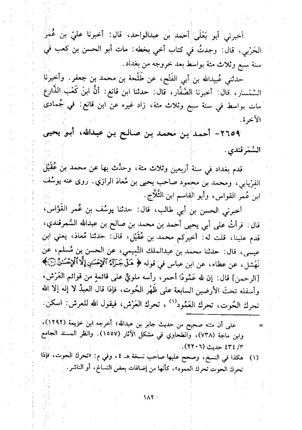 2659 - أَحْمَد بْن مُحَمَّد بْن صالح بْن عَبْد اللَّه أَبُو يَحْيَى السمرقندي قدم بغداد فِي سنة أربعين وثلاث مائة، وحدث بها عَن مُحَمَّد بْن عقيل الفريابي، ومحمد بْن محمود صاحب يَحْيَى بْن معاذ الرازي، روى عنه: يوسف بْن عمر القواس، وأبو القاسم ابْن الثلاج.