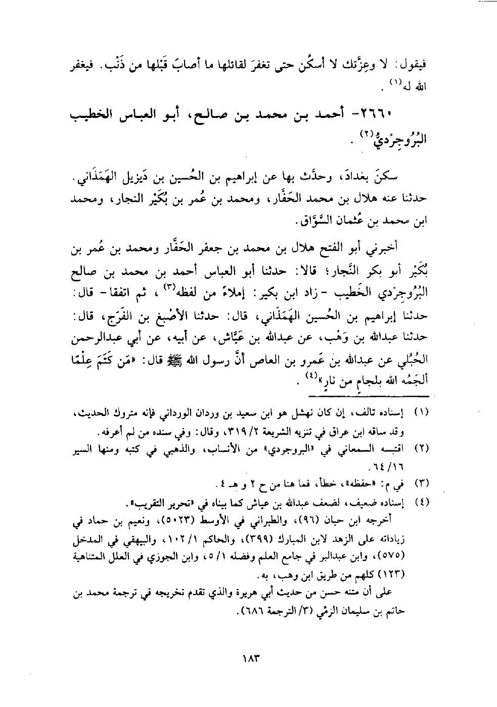2660 - أَحْمَد بْن مُحَمَّد بْن صالح أَبُو العباس الخطيب الْبُرُوجِرْدِيُّ سكن بغداد، وحدث بها عَن إِبْرَاهِيم بْن الحسني بْن ديزيل الهمذاني.