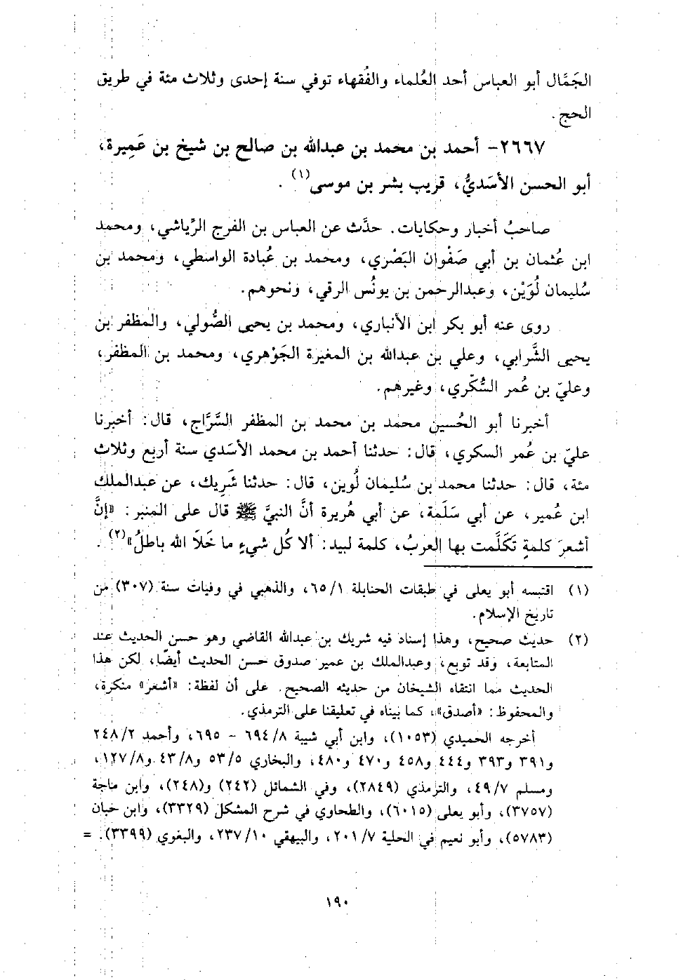 2667 - أَحْمَد بْن مُحَمَّد بْن عَبْد اللَّه بْن صَالِح بْن شيخ بْن عميرة أَبُو الحسن الأسدي قريب بشر بْن موسى، صَاحب أخبار وحكايات، حدث عَنِ العباس بْن الفرج الرياشي، ومحمد بْن عثمان بْن أَبِي صفوان البصري، ومحمد بْن عبادة الواسطي، ومحمد بْن سُلَيْمَان لوين، وعبد الرحمن بْن يونس الرقي، ونحوهم.