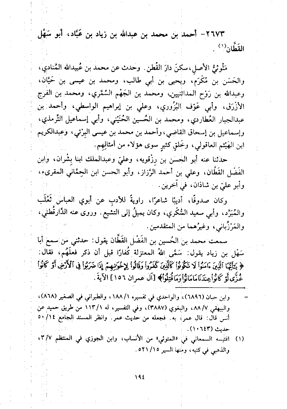 2673 - أَحْمَد بْن مُحَمَّد بْن عَبْد اللَّه بْن زياد بْن عباد أَبُو سهل القطان متوثي الأصل، سكن دار القطن، وحدث عَن مُحَمَّد بْن عبيد اللَّه المنادي، وَالحسن بْن مكرم، ويحيى بْن أَبِي طَالِب، ومحمد بْن عيسى بْن حيان، وعبد اللَّه بْن روح المدائنيين، ومحمد بْن الجهم السمري، ومحمد بْن الفرج الأزرق، وأبي عوف البزوري، وعلي بْن إِبْرَاهِيم الواسطي، وأَحْمَد بْن عَبْد الجبار العطاردي، ومحمد بْن الحسين الحنيني، وأبي إسماعيل الترمذي، وإسماعيل بْن إسحاق القاضي، وأَحْمَد بْن مُحَمَّد بْن عيسى البرتي، وعبد الكريم بْن الهيثم العاقولي، وخلق كثير سوى هؤلاء من أمثالهم.