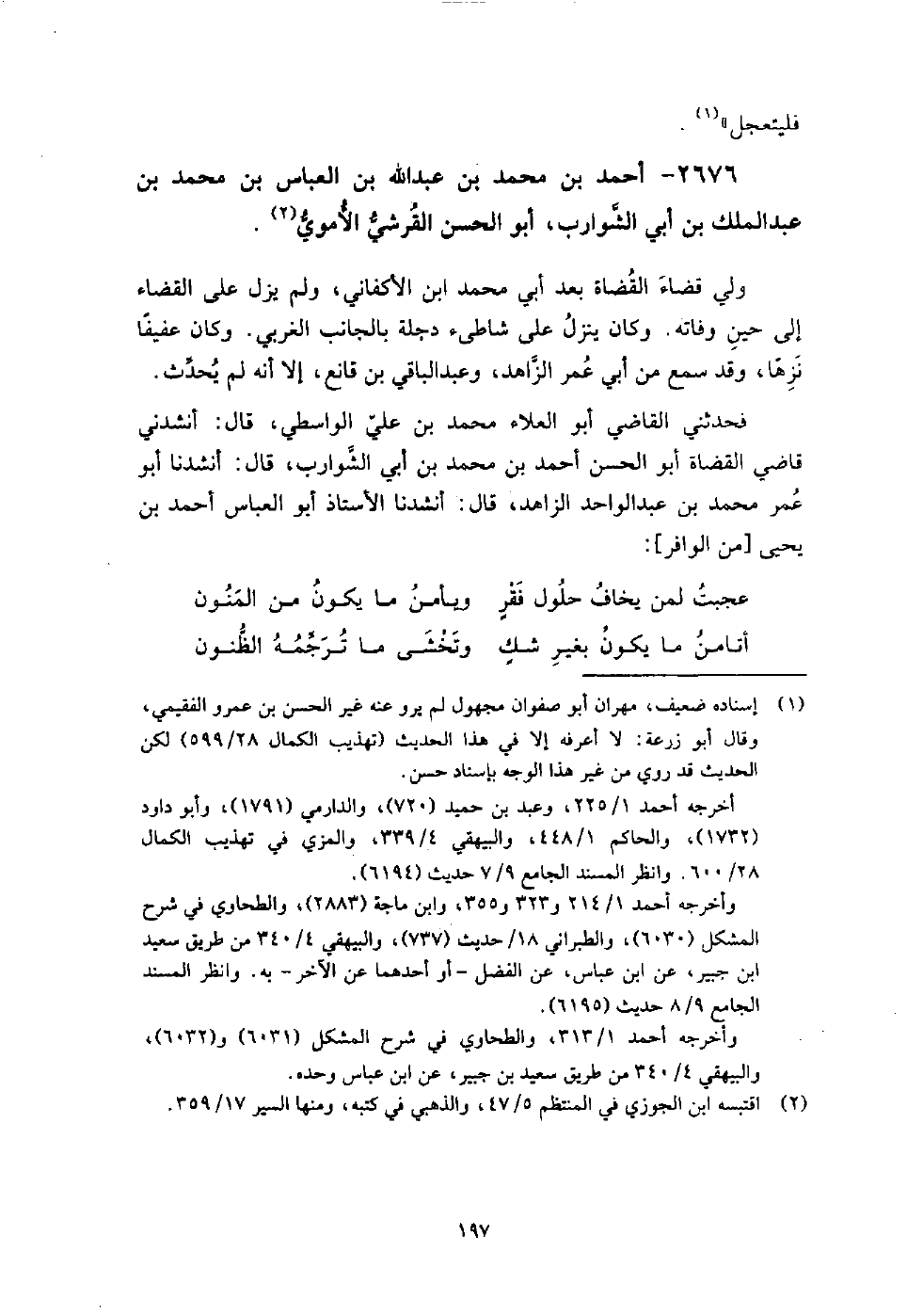 2676 - أَحْمَد بْن مُحَمَّد بْن عَبْد اللَّه بْن العباس بْن مُحَمَّد بْن عَبْد الملك بْن أَبِي الشوارب أَبُو الْحَسَن القرشي الأموي ولي قضاء القضاة بعد أَبِي مُحَمَّد ابْن الأكفاني، ولم يزل عَلَى القضاء إِلَى حين وفاته، وكَانَ ينزل عَلَى شاطئ دجلة بالجانب الغربي، وكَانَ عفِيفا نزها، وقد سمع من أَبِي عُمَر الزاهد، وعبد الباقي بْن قانع، إلا أنه لم يحدث.