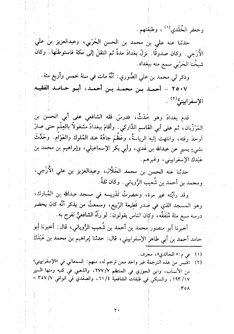 2507 - أَحْمَد بْن مُحَمَّد بْن أَحْمَد أَبُو حامد الفقيه الإسفراييني قدم بغداد، وهو حدث، فدرس فقه الشافعي عَلَى أَبِي الحسن بْن المرزبان، ثم عَلَى أَبِي القاسم الداركي، وأقام ببغداد مشغولا بالعلم حتى صار أوحد وقته، وانتهت إليه الرياسة، وعظم جاهه عند الملوك وَالعوام، وحدث بشيء يسير عَن عَبْد اللَّه بْن عدي، وأبي بكر الإسماعيلي، وإبراهيم بْن مُحَمَّد بْن عبدك الإسفراييني، وغيرهم حَدَّثَنَا عنه الحسن بن محمد الخلال، وعبد العزيز بن علي الأزجي، ومحمد بن أحمد بن شعيب الروياني، وكان ثقة.