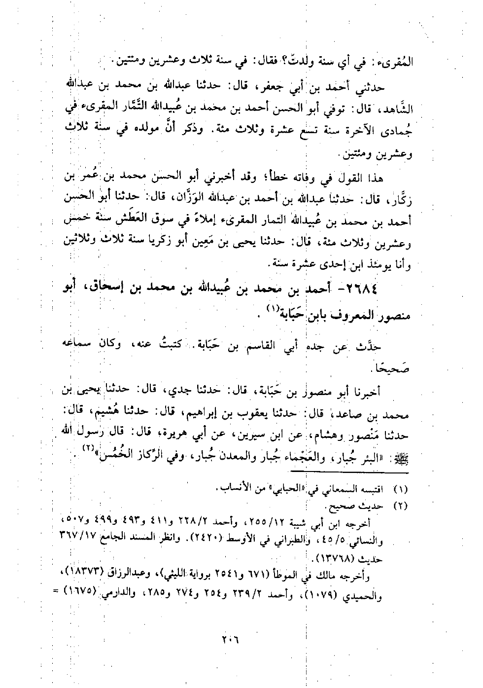 (1710) -[6: 206] أَخْبَرَنَا أَبُو مَنْصُورِ بْنُ حُبَّابَةَ، قَالَ: حَدَّثَنَا جَدِّي، قَالَ: حَدَّثَنَا يَحْيَى بْنُ مُحَمَّدِ بْنِ صَاعِدٍ، قَالَ: حَدَّثَنَا يَعْقُوبُ بْنُ إِبْرَاهِيمَ، قَالَ: حَدَّثَنَا هُشَيْمٌ، قَالَ: حَدَّثَنَا مَنْصُورٌ وَهِشَامٌ، عَنِ ابْنِ سِيرِينَ، عَنْ أَبِي هُرَيْرَةَ، قَالَ: قَالَ رَسُولُ اللَّهِ صَلَّى اللَّهُ عَلَيْهِ وَسَلَّمَ: " الْبِئْرُ جُبَارٌ، وَالْعَجْمَاءُ جُبَارٌ، وَالْمَعْدِنُ جُبَارٌ، وَفِي الرِّكَازِ الْخُمُس " مات قرب آخر سنة تسع وثلاثين وأربع مائة