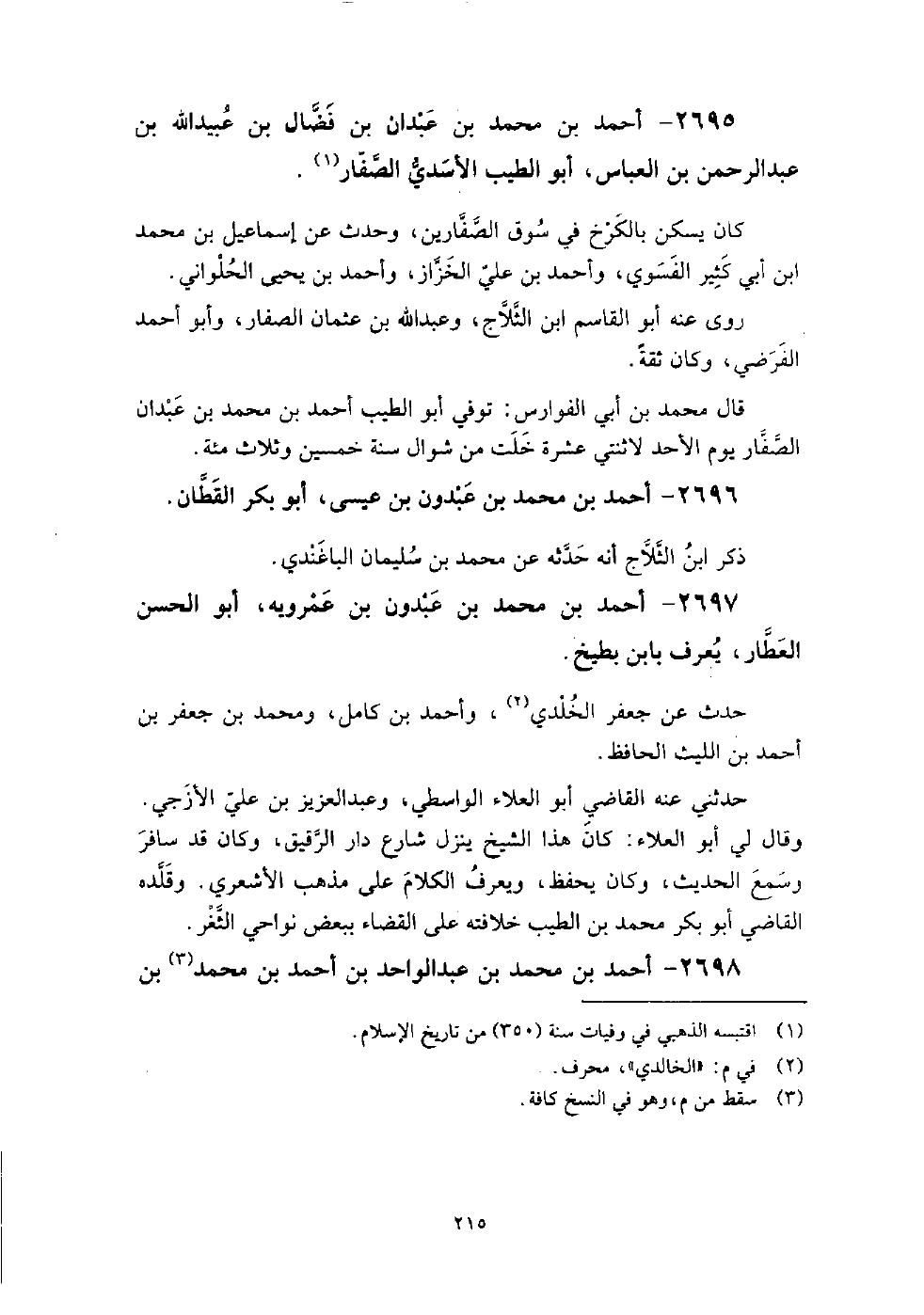2696 - أَحْمَد بْن مُحَمَّد بْن عبدون بْن عيسى أَبُو بَكْر القطان ذكر ابْن الثلاج أنه حدثه عَن مُحَمَّد بْن سُلَيْمَان الباغندي.