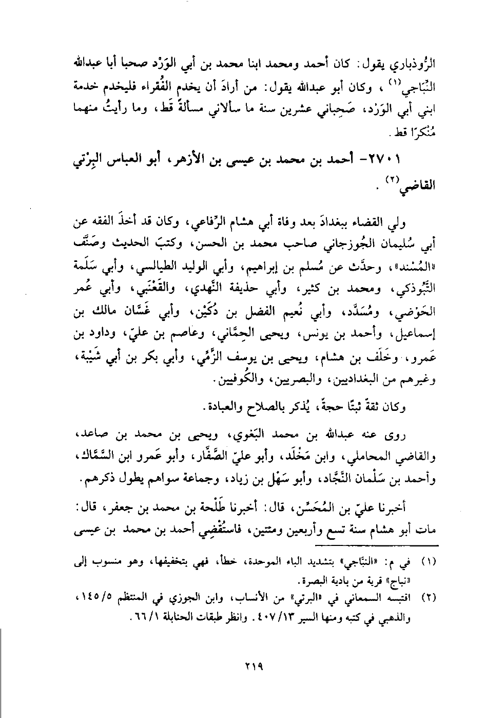 2701 - أَحْمَد بْن مُحَمَّد بْن عيسى بْن الأزهر أَبُو الْعَبَّاس البرتي الْقَاضِي ولي القضاء ببغداد بعد وفاة أَبِي هشام الرفاعي، وكَانَ قد أخذ الفقه عَن أَبِي سُلَيْمَان الجوزجاني صاحب مُحَمَّد بْن الْحَسَن، وكتب الْحَدِيث، وصنف المسند، وحدث عَن مسلم بْن إِبْرَاهِيم، وأبي الوليد الطيالسي، وأبي سلمة التبوذكي، ومحمد بْن كثير، وأبي حذيفة النهدي، والقعنبي، وأبي عُمَر الحوضي، ومسدد، وأبي نعيم الفضل بْن دكين، وأبي غسان مالك بْن إسماعيل، وأَحْمَد بْن يونس، ويحيى الحماني، وعاصم بْن عَلِيّ، وداود بْن عمرو، وخلف بْن هشام، ويحيى بْن يُوسُف الزِّمِّي، وأبي بكر بْن أَبِي شيبة، وغيرهم من البغداديين، وَالبصريين، وَالكوفِيين.