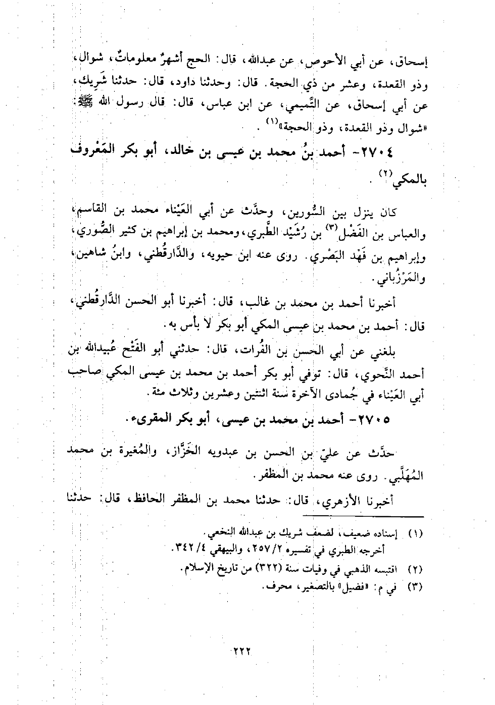 2704 - أَحْمَد بْن مُحَمَّد بْن عيسى بْن خالد أَبُو بَكْر المعروف بالمكي كَانَ ينزل بين السورين، وحدث عَن أَبِي العيناء مُحَمَّد بْن الْقَاسِم، وَالْعَبَّاس بْن فضيل بْن رشيد الطبري، ومحمد بْن إِبْرَاهِيم بْن كثير الصوري، وإبراهيم بْن فهد البصري، روى عنه: ابْن حيويه، وَالدارقطني، وابن شاهين، وَالمرزباني.