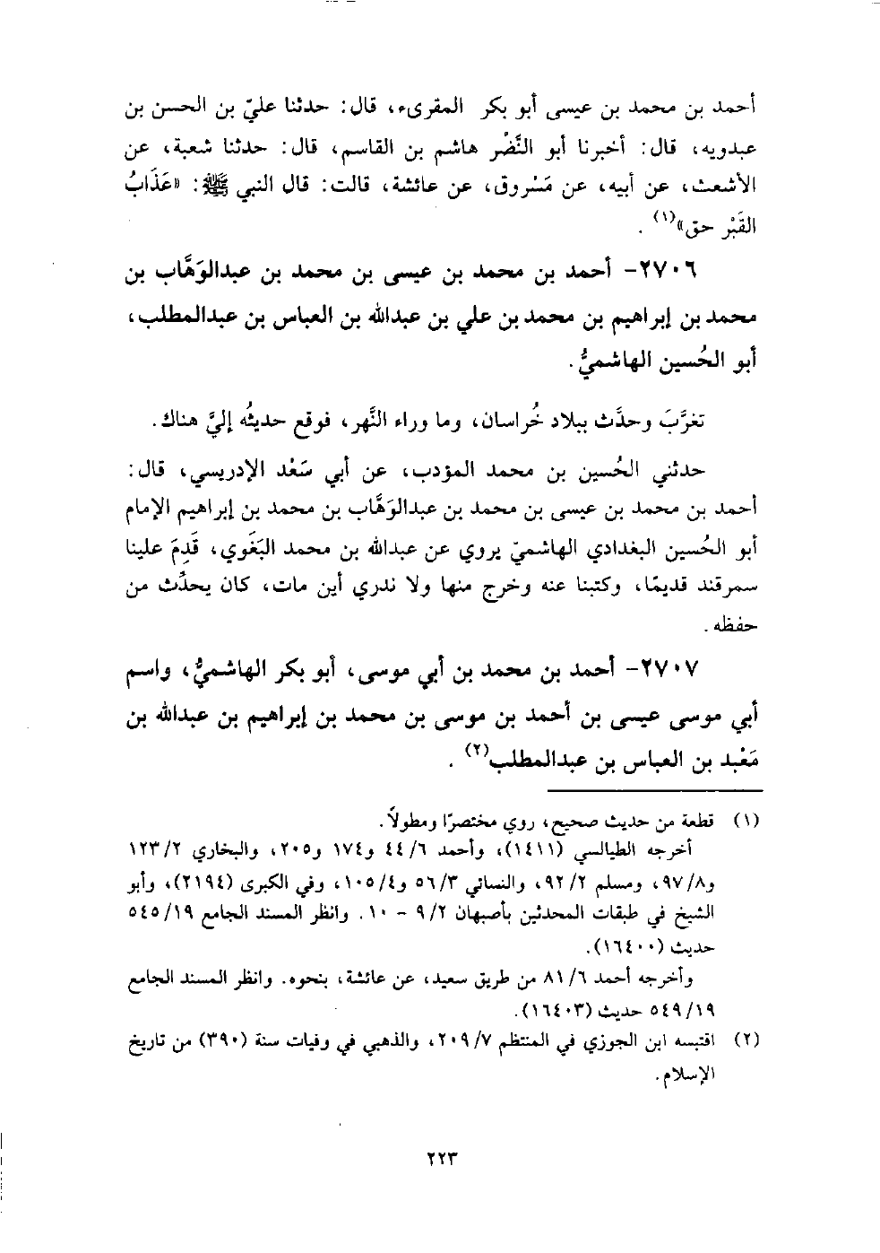 2706 - أَحْمَد بْن مُحَمَّد بْن عِيسَى بْن مُحَمَّد بْن عَبْد الوهاب بْن مُحَمَّد بْن إِبْرَاهِيم بْن مُحَمَّد بْن عَلِيّ بْن عَبْد اللَّهِ بْن الْعَبَّاس بْن عَبْد المطلب أَبُو الحسين الهاشمي تغرب وحدث ببلاد خراسان، وما وراء النهر، فوقع حَدِيثه إلي هناك.