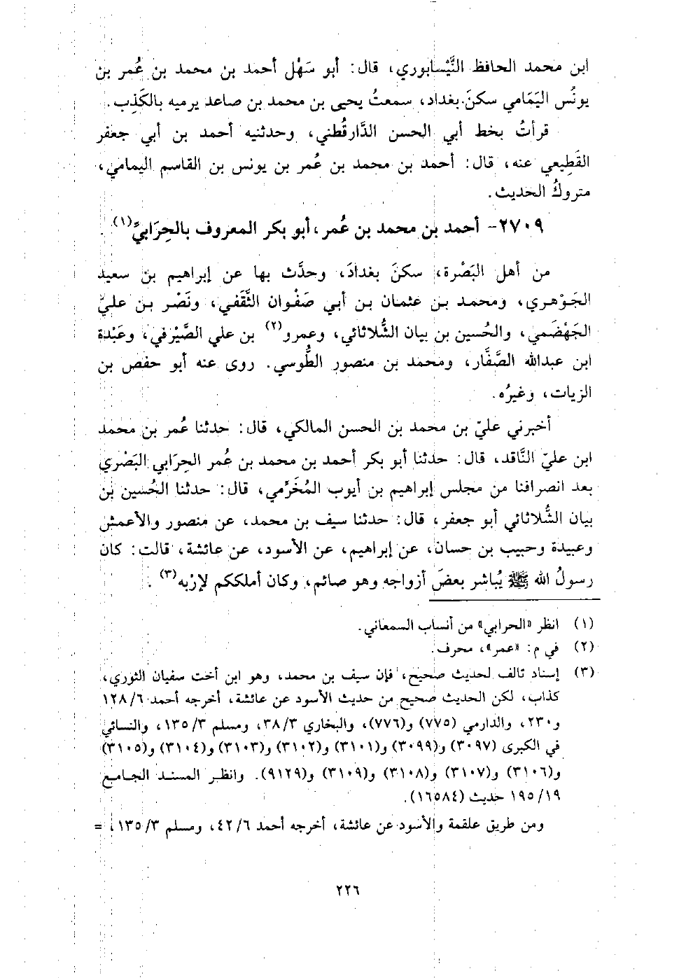 2709 - أَحْمَد بْن مُحَمَّد بْن عُمَر أَبُو بَكْر المعروف بالحرابي من أهل البصرة، سكن بغداد، وحدث بِهَا عَن إِبْرَاهِيم بْن سَعِيد الجوهري، ومحمد بْن عثمان بْن أَبِي صفوان الثقفِي، ونصر بْن عَلِيّ الجهضمي، وَالحسين بْن بيان الشلاثائي، وعمر بْن عَلِيّ الصيرفِي، وعبدة بْن عَبْد اللَّهِ الصفار، ومحمد بْن منصور الطوسي، روى عنه: أَبُو حفص ابن الزيات، وغيره.