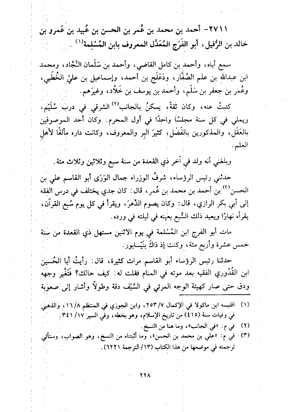 2711 - أَحْمَد بْن مُحَمَّد بْن عُمَر بْن الْحَسَن بْن عبيد بْن عمرو بْن خالد بْن الرُّفيل أَبُو الفرج المعدل المعروف بابن المسلمة سمع أباه، وأَحْمَد بْن كامل الْقَاضِي، وأَحْمَد بْن سلمان النجاد، ومحمد بْن عَبْد اللَّهِ بْن علم الصفار، ودعلج بْن أَحْمَد، وإسماعيل بْن عَلِيّ الخطبي، وعمر بْن جَعْفَر بْن سلم، وأَحْمَد بْن يُوسُف بْن خلاد، وغيرهم.