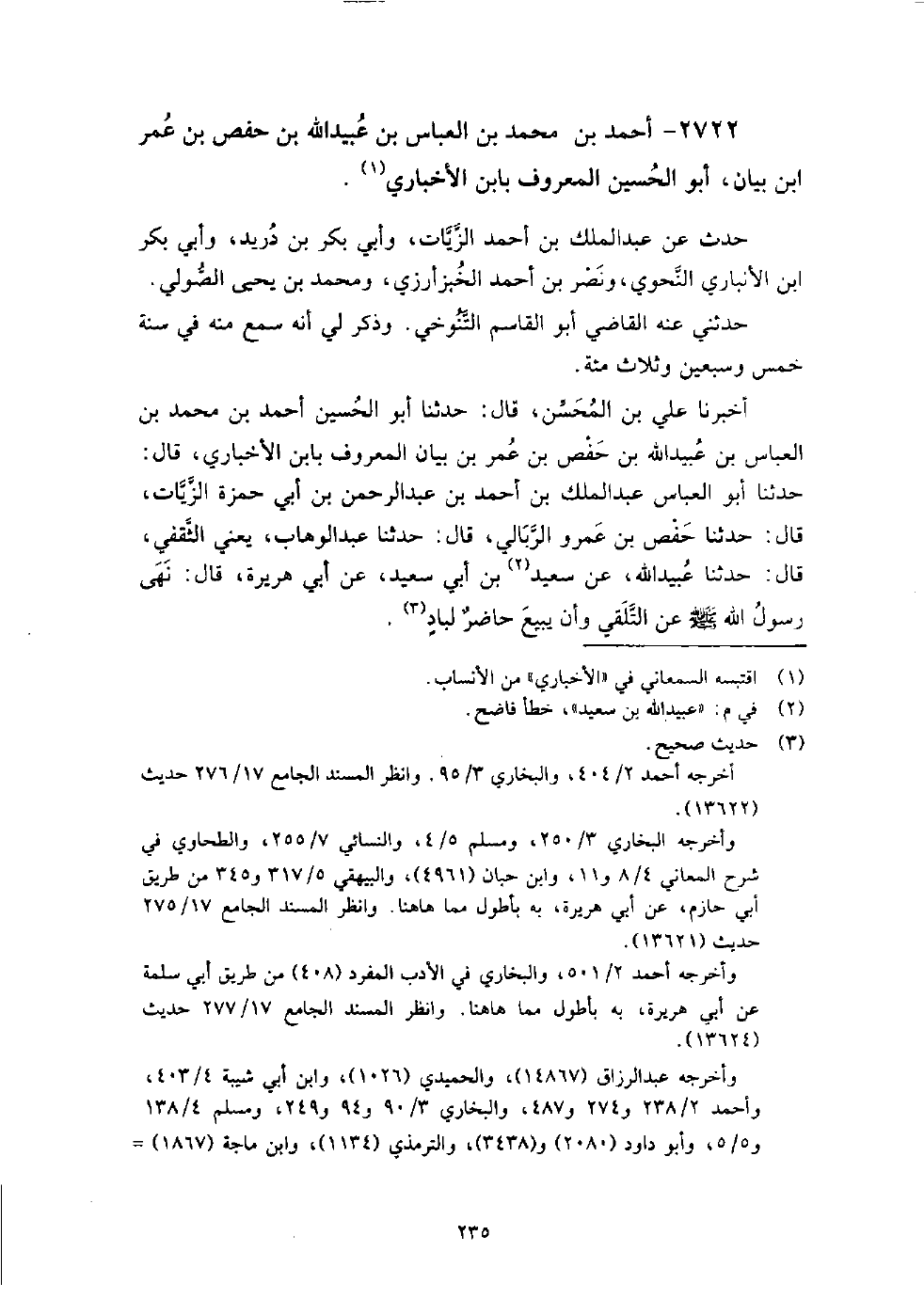 (1724) أَخْبَرَنَا عَلِيُّ بْنُ الْمُحْسِنِ، قَالَ: حَدَّثَنَا أَبُو الْحُسَيْنِ أَحْمَدُ بْنُ مُحَمَّدِ بْنِ الْعَبَّاسِ بْنِ عُبَيْدِ اللَّهِ بْنِ حَفْصِ بْنِ عُمَرَ بْنِ بَيَانَ الْمَعْرُوفُ بِابْنِ الأَخْبَارِيِّ، قَالَ: حَدَّثَنَا أَبُو الْعَبَّاسِ عَبْدُ الْمَلِكِ بْنُ أَحْمَدَ بْنِ عَبْدِ الرَّحمَنِ بْنِ أَبِي حَمْزَةَ الزَّيَّاتُ، قَالَ: حَدَّثَنَا حَفْصُ بْنُ عَمْرٍو الرَّبَالِيُّ، قَالَ: حَدَّثَنَا عَبْدُ الْوَهَّابِ يَعْنِي الثَّقَفِيَّ، قَالَ: حَدَّثَنَا عُبَيْدُ اللَّهِ، عَنْ سَعِيدِ بْنِ أَبِي سَعِيدٍ، عَنْ أَبِي هُرَيْرَةَ، قَالَ: " نَهَى رَسُولُ اللَّهِ صَلَّى اللَّهُ عَلَيْهِ وَسَلَّمَ عَنِ التَّلَقِّي، وَأَنْ يَبِيعَ حَاضِرٌ لِبَادٍ "