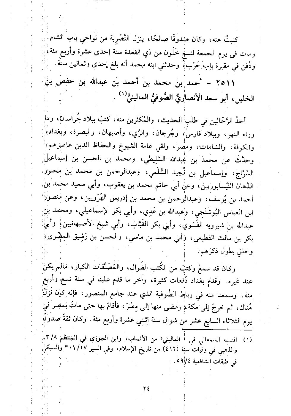 2511 - أَحْمَد بْن مُحَمَّد بْن أَحْمَد بْن عَبْد اللَّه بْن حفص بْن الخليل أَبُو سعد الأنصاري الصوفي الماليني أحد الرحالين في طلب الحديث، وَالمكثرين منه، كتب ببلاد خراسان، وما وراء النهر، وببلاد فارس، وجرجان، وَالري، وأصبهان، وَالبصرة، وبغداد، وَالكوفة، وَالشامات، ومصر ولقى عامة الشيوخ وَالحفاظ الذين عاصرهم، وحدث عَن مُحَمَّد بْن عَبْد اللَّه السليطي، ومحمد بْن الحسن بْن إسماعيل السراج، وإسماعيل بْن نجيد السلمي، وعبد الرحمن بْن مُحَمَّد بْن محبور الدهان النيسابوريين، وعن أَبِي حاتم مُحَمَّد بْن يعقوب، وأبي سعيد مُحَمَّد بْن أَحْمَد بْن يوسف، وعبد الرحمن بْن مُحَمَّد بْن إدريس الهرويين، وعن منصور بْن العباس البوشنجي، وعبد اللَّه بْن عدي، وأبي بكر الإسماعيلي، ومحمد بْن عَبْد اللَّه بْن شيرويه الفسوي، وأبي بكر القباب، وأبي شيخ الأصبهانيين، وأبي بكر بْن مالك القطيعي، وأبي مُحَمَّد بْن ماسي، وَالحسن بْن رشيق المصري، وخلق يطول ذكرهم.