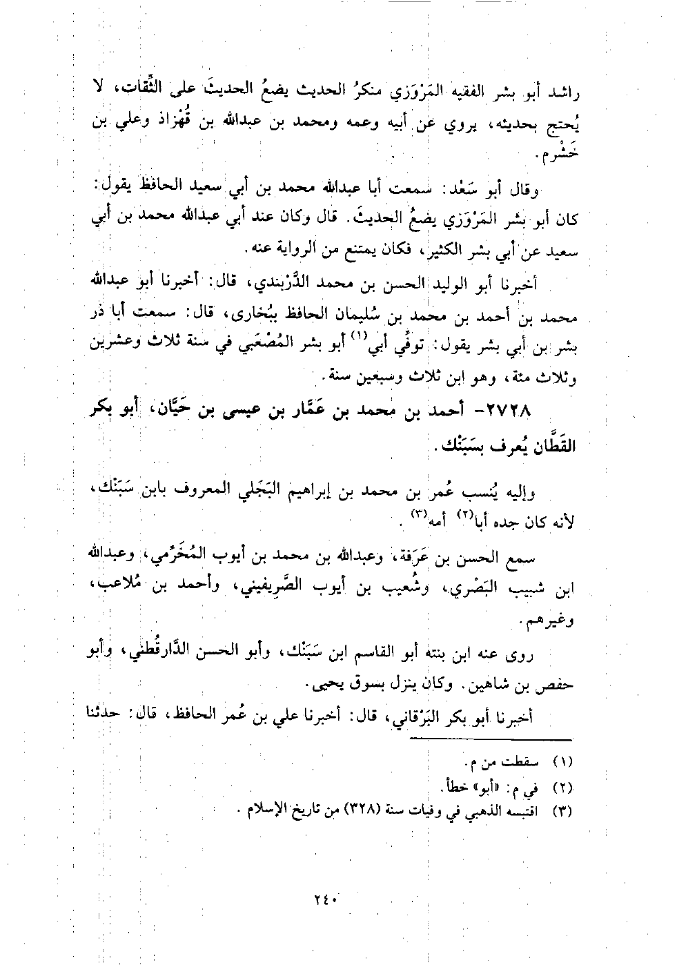 2728 - أَحْمَد بْن مُحَمَّد بْن عمار بْن عِيسَى بْن حيان أَبُو بَكْر القطان يعرف بسبنك وإليه ينسب عُمَر بْن مُحَمَّد بْن إِبْرَاهِيم البجلي المعروف بابن سبنك، لأنه كَانَ جده أَبا أمه.