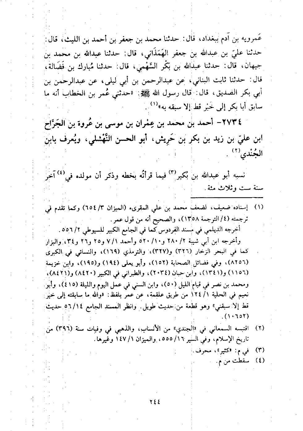 2734 - أَحْمَد بْن مُحَمَّد بْن عمران بْن موسى بْن عروة بْن الجراح بْن عَلِيّ بْن زيد بْن بكر بْن حريش أَبُو الْحَسَن النهشلي ويعرف بابن الجندي نسبه أَبُو عَبْد اللَّهِ بْن بكير فِيما قرأته بخطه وذكر أن مولده في آخر سنة ست وثلاث مائة.