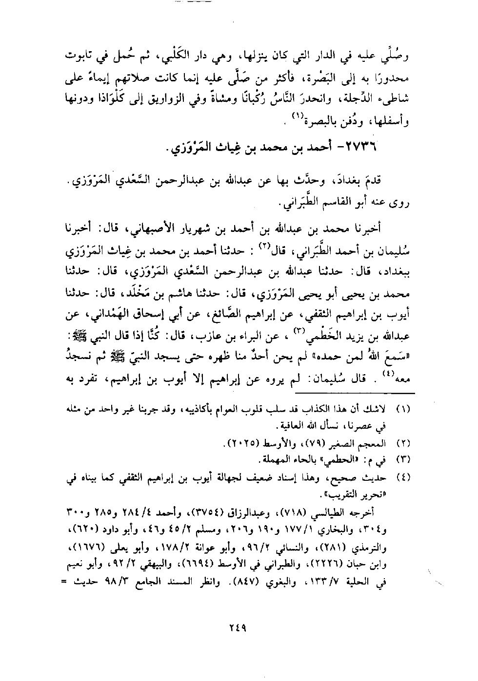 2736 - أَحْمَد بْن مُحَمَّد بْن غياث المروزي قدم بغداد، وحدث بِهَا عَن عَبْد اللَّهِ بْن عَبْد الرحمن السعدي المورزي، روى عنه: أَبُو الْقَاسِم الطبراني.