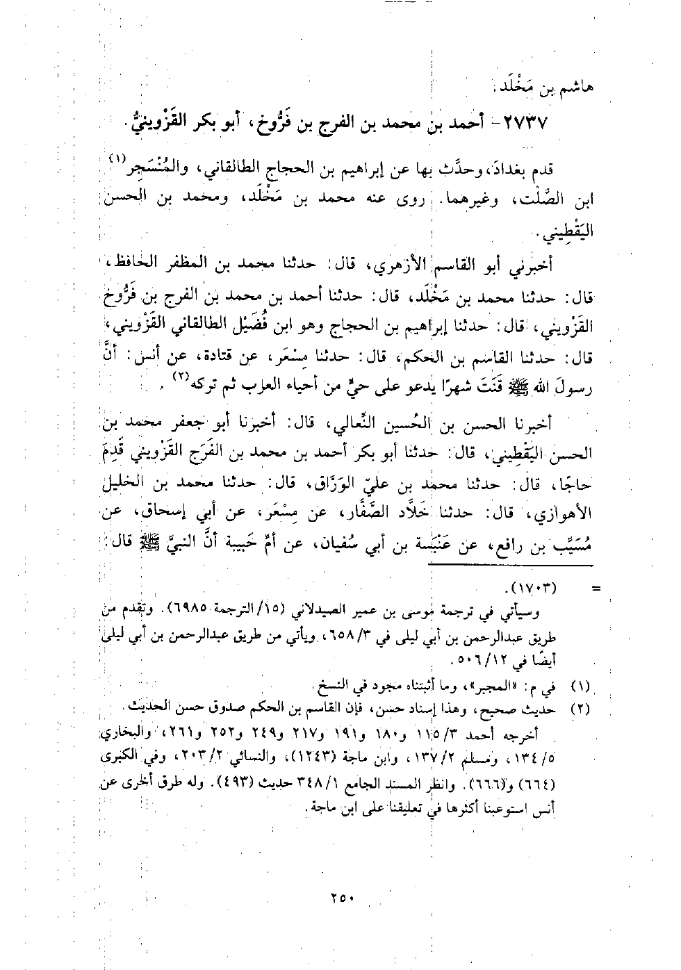 2737 - أَحْمَد بْن مُحَمَّد بْن الفرج بْن فروخ أَبُو بَكْر القزويني قدم بغداد، وحدث بِهَا عَن إِبْرَاهِيم بْن الحجاج الطالقاني، وَالمنسجر بْن الصلت، وغيرهما.