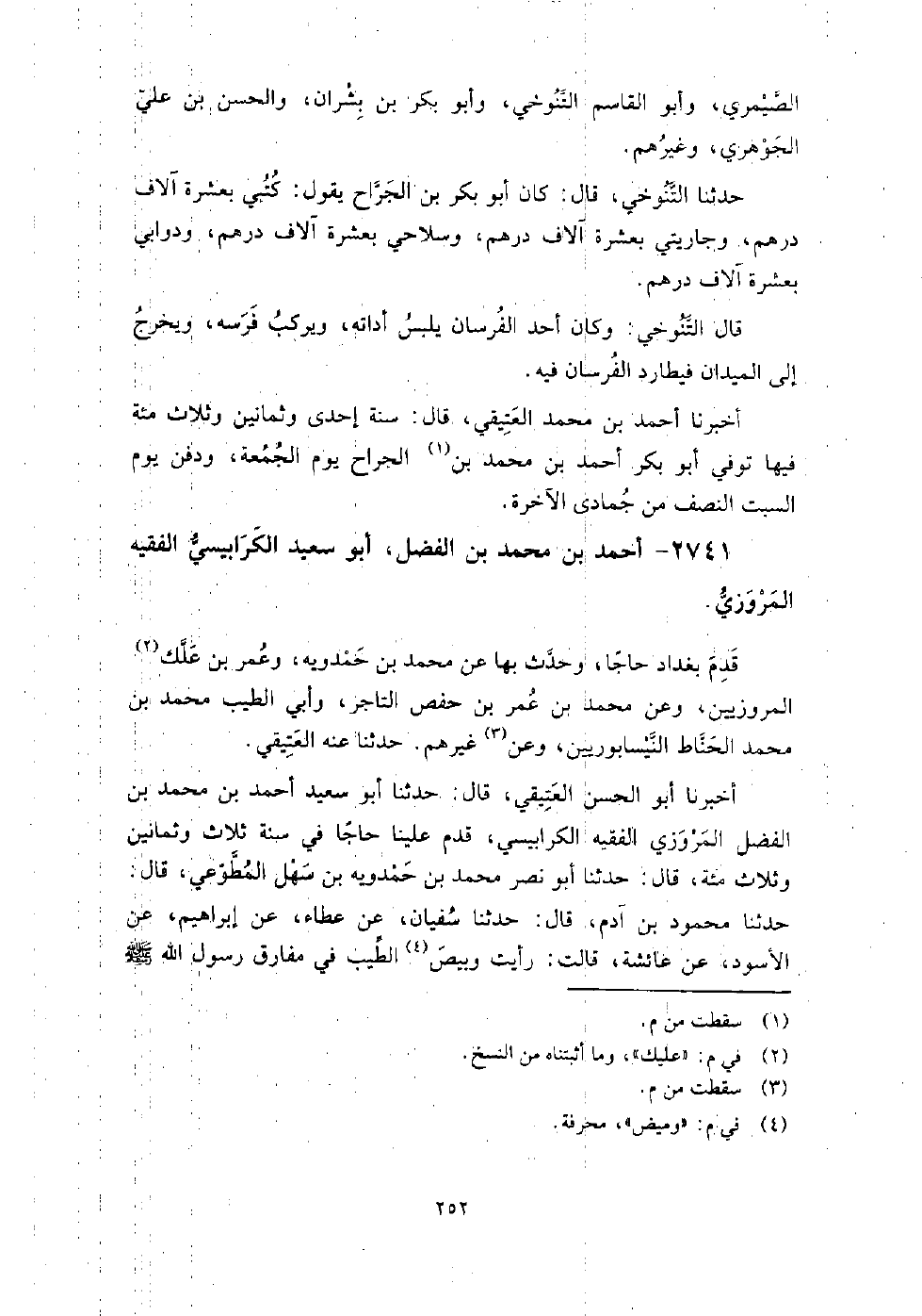 2741 - أَحْمَد بْن مُحَمَّد بْن الفضل أَبُو سَعِيد الكرابيسي الفقيه الْمَرْوَزِيُّ قدم بغداد حاجا، وحدث بِهَا عَن مُحَمَّد بْن حمدويه، وعمر بْن علك المروزيين، وعن محمد بن عمر بن حفص التاجر، وأبي الطيب محمد بن محمد الحناط النيسابوريين، وغيرهم، حَدَّثَنَا عنه العتيقي.