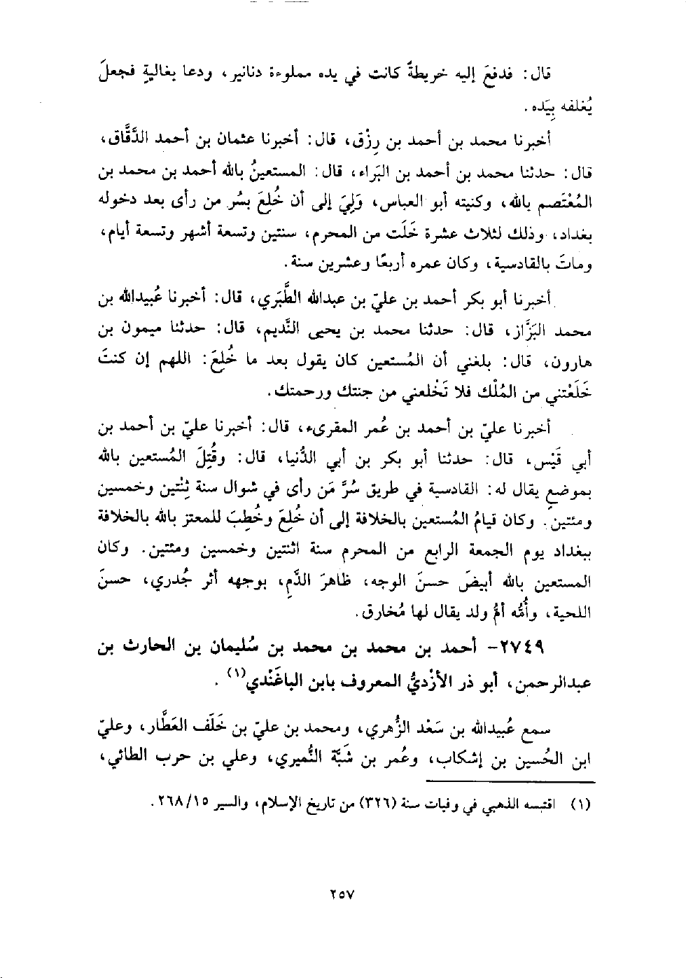 2749 - أَحْمَد بْن مُحَمَّد بْن مُحَمَّد بْن سُلَيْمَان بْن الحارث بْن عَبْد الرحمن أَبُو ذر الأزدي المعروف بابن الباغندي سمع عبيد اللَّه بْن سعد الزهري، ومحمد بْن عَلِيّ بْن خلف العطار، وعلى بْن الحسين بْن إشكاب، وعمر بْن شبة النميري، وعلي بْن حرب الطائي، وسعدان بْن نصر المخرمي، وإِسْحَاق بْن سيار النصيبي.