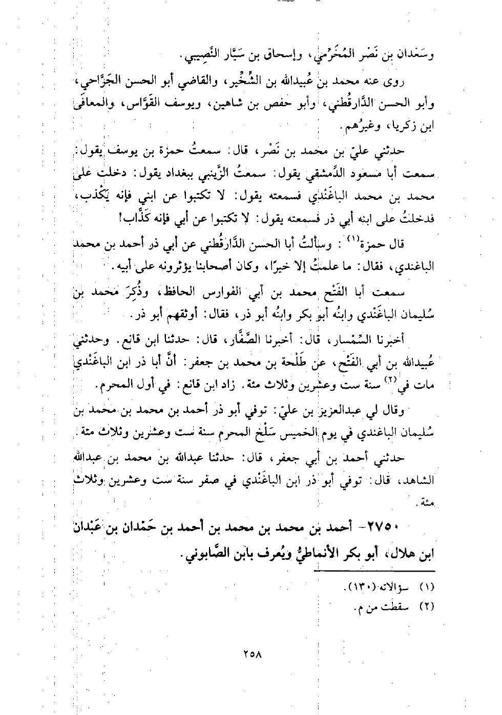 2750 - أَحْمَد بْن مُحَمَّد بْن مُحَمَّد بْن أَحْمَد بْن حمدان بْن عبدان بْن هلال أَبُو بَكْر الأنماطي ويعرف بابن الصابوني حدث عَن مُحَمَّد بْن عَبْد اللَّهِ بْن سُلَيْمَان الحضرمي الكوفِي روى عنه أَبُو الفتح بْن مسرور البلخي، وذكر أنه سمع منه ببغداد، وَقَالَ كَانَ مولده ببغداد سنة ثمان وسبعين ومائتين، وكَانَ من الثقات الحفاظ المجودين.