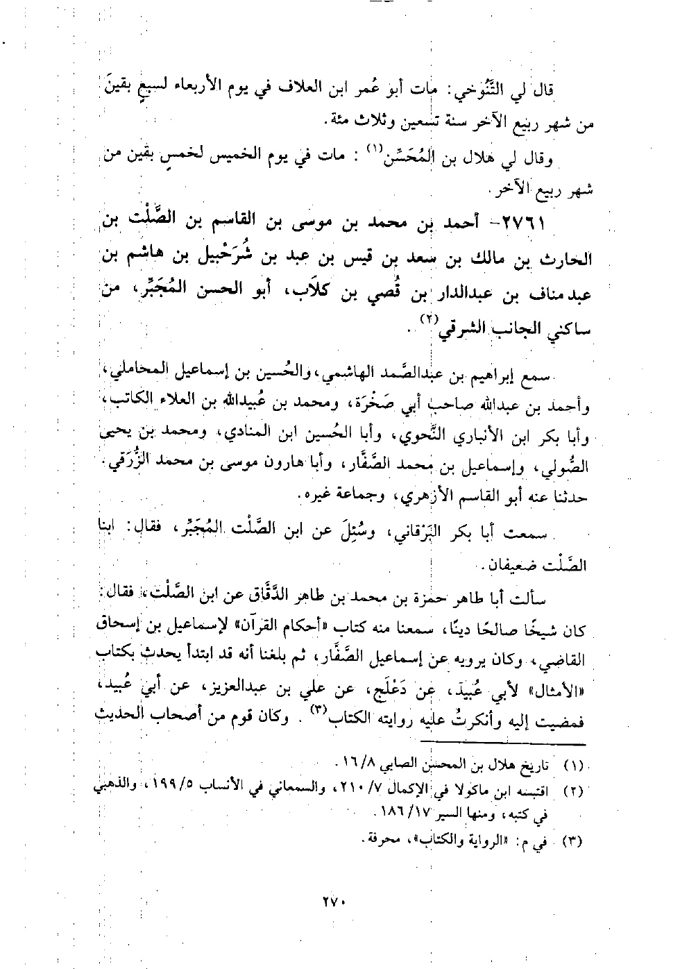 2761 - أَحْمَد بْن مُحَمَّد بْن موسى بْن الْقَاسِم بْن الصلت بْن الحارث بْن مالك بْن سعد بْن قيس بْن عَبْد بْن شرحبيل بْن هاشم بْن عَبْد مناف بْن عَبْد الدار بْن قصي بْن كلاب أَبُو الْحَسَن المجبر من ساكني الجانب الشرقي،