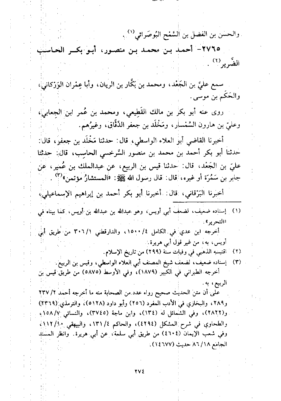 2765 - أَحْمَد بْن مُحَمَّد بْن منصور أَبُو بَكْر الحاسب الضرير سمع عَلِيّ بْن الجعد، ومحمد بْن بكار بْن الريان، وأبا عمران الوركَانَي، وَالحكم بْن موسى.