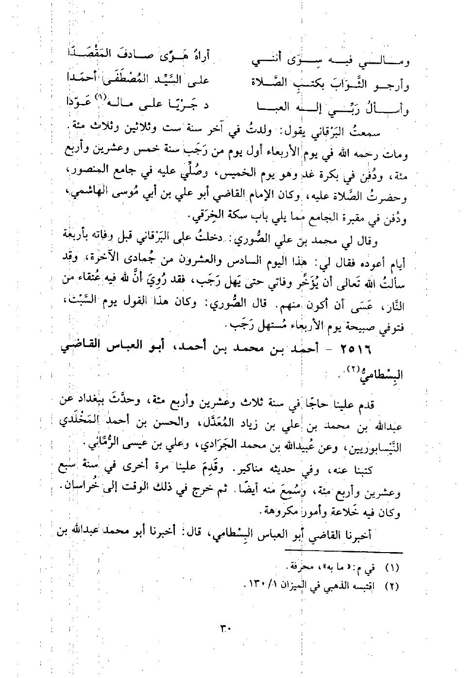 2516 - أَحْمَد بْن مُحَمَّد بْن أَحْمَد أَبُو العباس القاضي البسطامي قدم عَلَيْنَا حاجا في سنة ثلاث وعشرين وأربع مائة، وحدث ببغداد عَن عَبْد اللَّه بْن مُحَمَّد بْن علي بْن زياد المعدل، وَالحسن بْن أَحْمَد المخلدي النيسابوريين، وعن عبيد اللَّه بْن مُحَمَّد الجرادي، وعلي بْن عيسى الرماني.