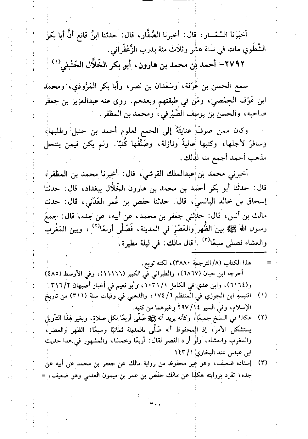2792 - أَحْمَد بْن مُحَمَّد بْن هارون أَبُو بَكْر الخلال الحَنْبَلي سمع الْحَسَن بْن عرفة، وسعدان بْن نصر، وأبا بكر الْمَرْوَزِيُّ، ومحمد بْن عوف الحمصي، ومن فِي طبقتهم وبعدهم، روى عنه: عَبْد العزيز بْن جَعْفَر صاحبه، وَالحسن بْن يُوسُف الصيرفِي، ومحمد بْن المظفر.