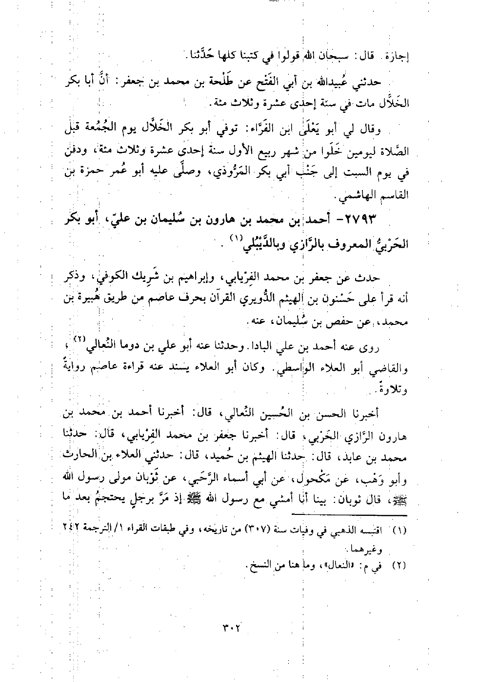 2793 - أَحْمَد بْن مُحَمَّد بْن هارون بْن سُلَيْمَان بْن عَلِيّ أَبُو بَكْر الحربي المعروف بالرازي وبالديبلي حدث عَن جَعْفَر بْن مُحَمَّد الفريابي، وإبراهيم بْن شريك الكوفِي، وذكر أنه قرأ عَلَى حسنون بْن الهيثم الدويري القرآن بحرف عاصم من طريق هبيرة بْن مُحَمَّد، عَن حفص بْن سُلَيْمَان، عنه.