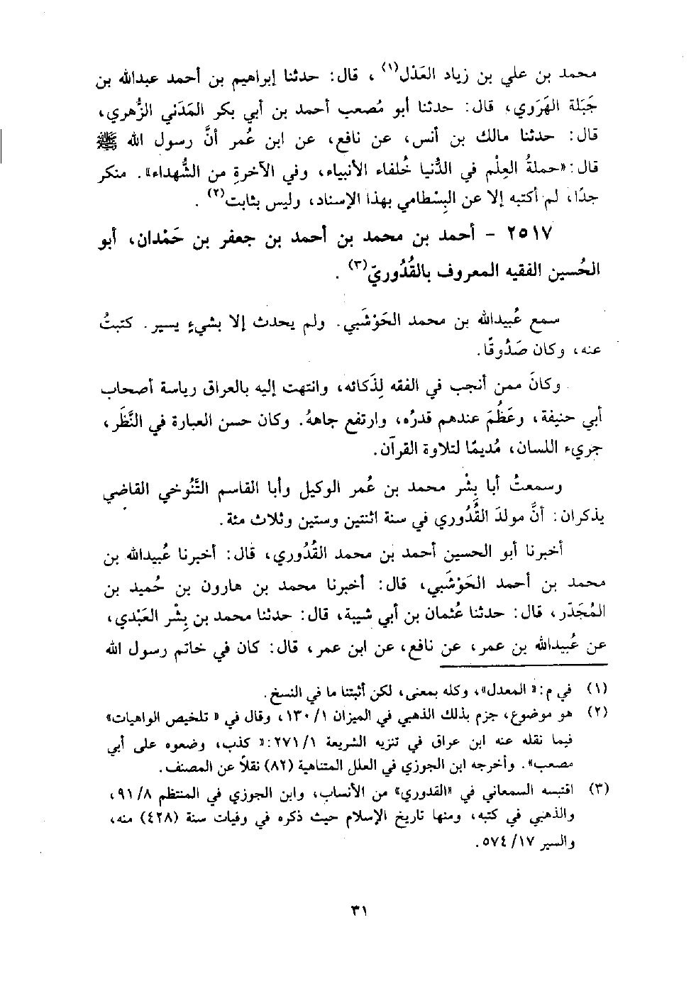 2517 - أَحْمَد بْن مُحَمَّد بْن أَحْمَد بْن جعفر بْن حمدان أَبُو الحسين الفقيه المعروف بالقدوري سمع عبيد اللَّه بْن مُحَمَّد الحوشبي.