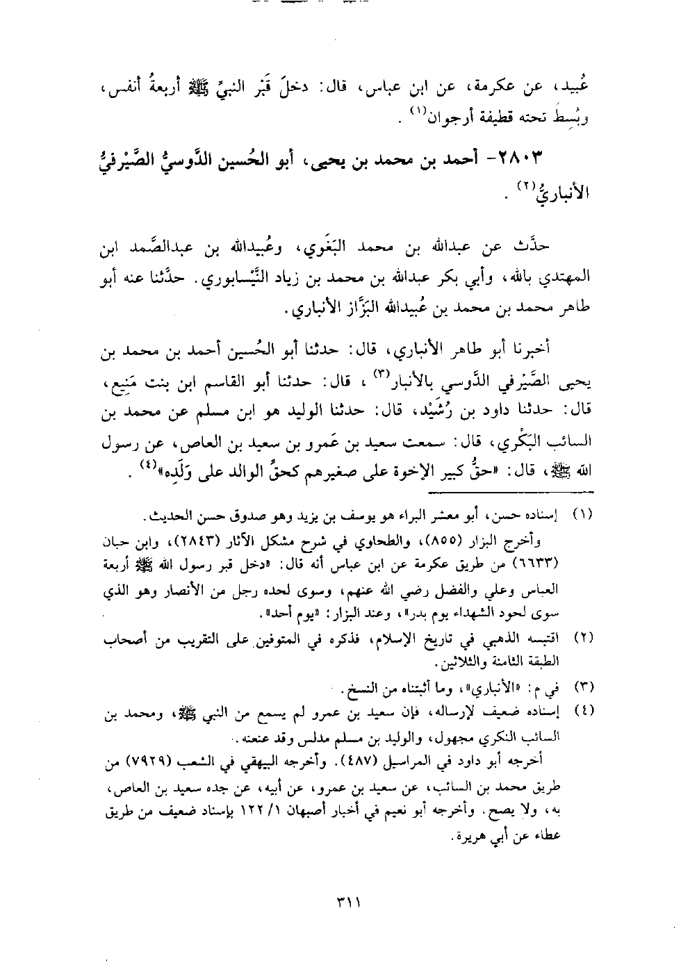 2803 - أَحْمَد بْن مُحَمَّد بْن يَحْيَى أَبُو الحسين الدوسي الصيرفِي الأنباري حدث عَن عَبْد اللَّهِ بْن مُحَمَّد البغوي، وعبيد اللَّه بْن عَبْد الصمد ابْن المهتدي بالله، وأبي بكر عَبْد اللَّهِ بْن مُحَمَّد بْن زياد النِّيسَابُورِيّ، حَدَّثَنَا عنه أَبُو طاهر مُحَمَّد بْن مُحَمَّد بْن عبيد اللَّه البزاز الأنباري.
