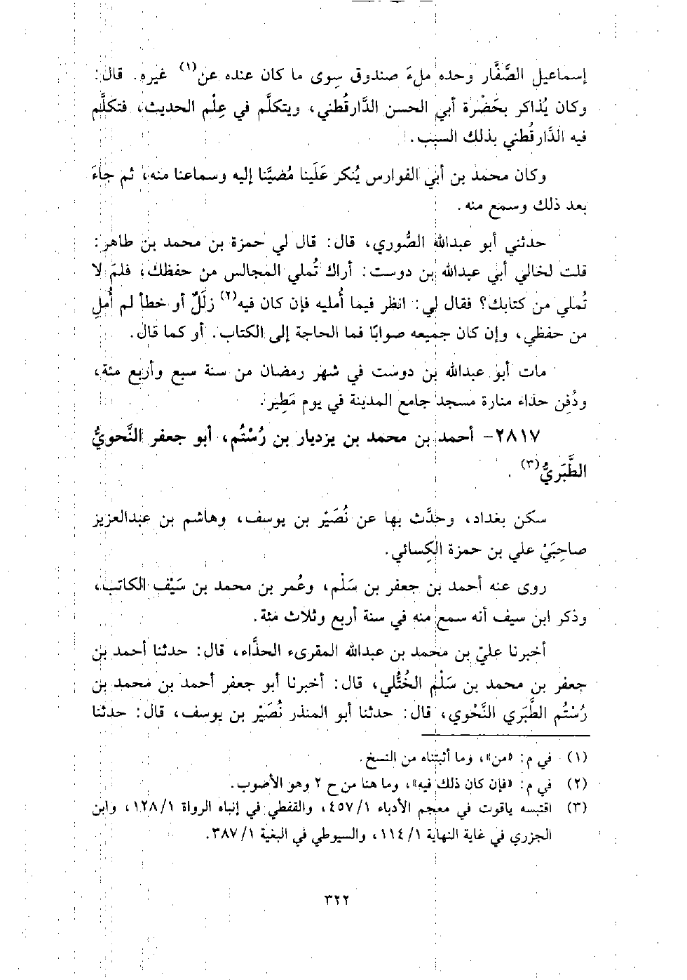 2817 - أَحْمَد بْن مُحَمَّد بْن يزديار بْن رستم أَبُو جَعْفَر النحوي الطبري سكن بغداد، وحدث بِهَا عَن نصير بْن يُوسُف، وهاشم بْن عَبْد العزيز صاحبي عَلِيّ بْن حمزة الكسائي.