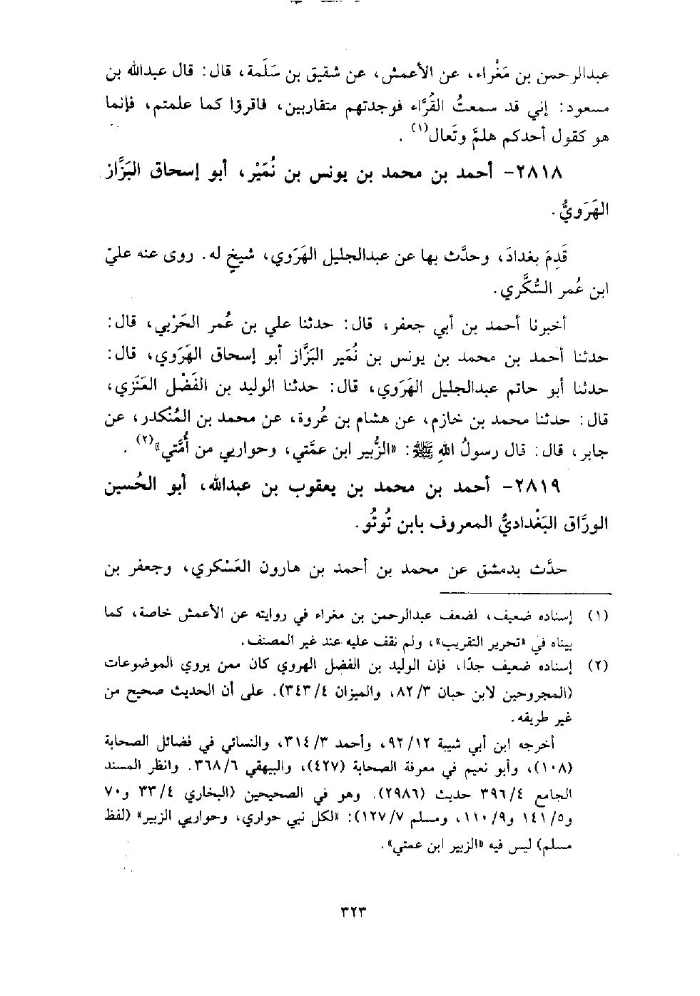 2818 - أَحْمَد بْن مُحَمَّد بْن يونس بْن نمير أَبُو إِسْحَاق البزاز الهروي قدم بغداد، وحدث بِهَا عَن عَبْد الجليل الهروي شيخ له، روى عنه: عَلِيّ بْن عُمَر السكري.