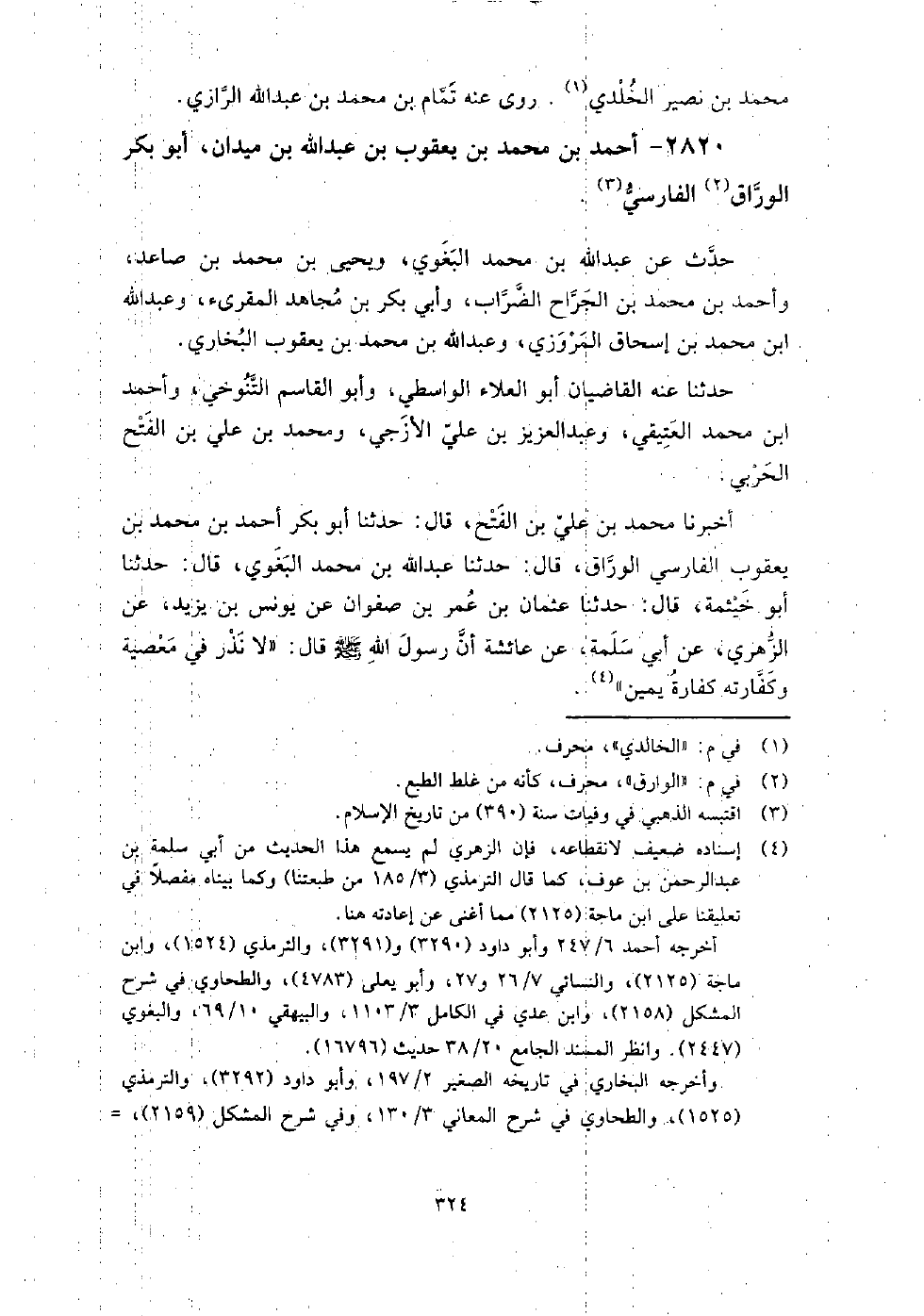 2820 - أَحْمَد بْن مُحَمَّد بْن يَعْقُوب بْن عَبْد اللَّهِ بْن ميدان أَبُو بَكْر الوراق الفارسي حدث عَن عَبْد اللَّهِ بْن مُحَمَّد البغوي، ويحيى بْن مُحَمَّد بْن صاعد، وأَحْمَد بْن الجراح الضراب، وأبي بكر بْن مجاهد المقرئ، وعبد اللَّه بْن مُحَمَّد بْن إِسْحَاق الْمَرْوَزِيُّ، وعبد اللَّه بْن مُحَمَّد بْن يَعْقُوب البخاري.