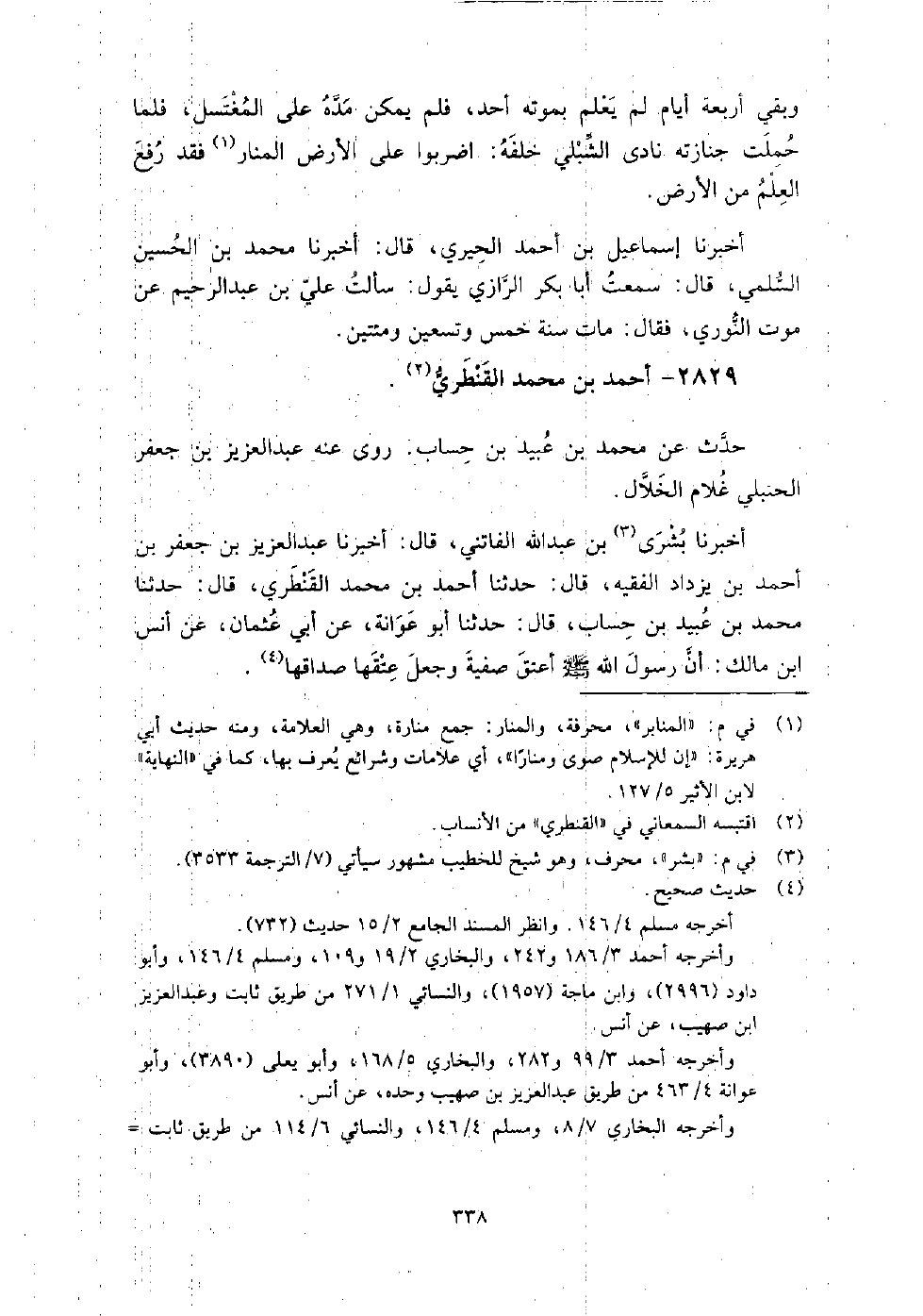 (1788) -[6: 338] حَدَّثَنَا بُشْرَى بْنُ عَبْدِ اللَّهِ الْفَاتِنِيُّ، قَالَ: حَدَّثَنَا عَبْدُ الْعَزِيزِ بْنُ جَعْفَرِ بْنِ أَحْمَدَ بْنِ يَزْدَادَ الْفَقِيهُ، قَالَ: أَخْبَرَنَا أَحْمَدُ بْنُ مُحَمَّدٍ الْقَنْطَرِيُّ، قَالَ: حَدَّثَنَا مُحَمَّدُ بْنُ عُبَيْدِ بْنِ حِسَابٍ، قَالَ: حَدَّثَنَا أَبُو عَوَانَةَ، عَنْ أَبِي عُثْمَانَ، عَنْ أَنَسِ بْنِ مَالِكٍ، أَنَّ رَسُولَ اللَّهِ صَلَّى اللَّهُ عَلَيْهِ وَسَلَّمَ " أَعْتَقَ صَفِيَّةَ، وَجَعَلَ عِتْقَهَا صَدَاقَهَا "