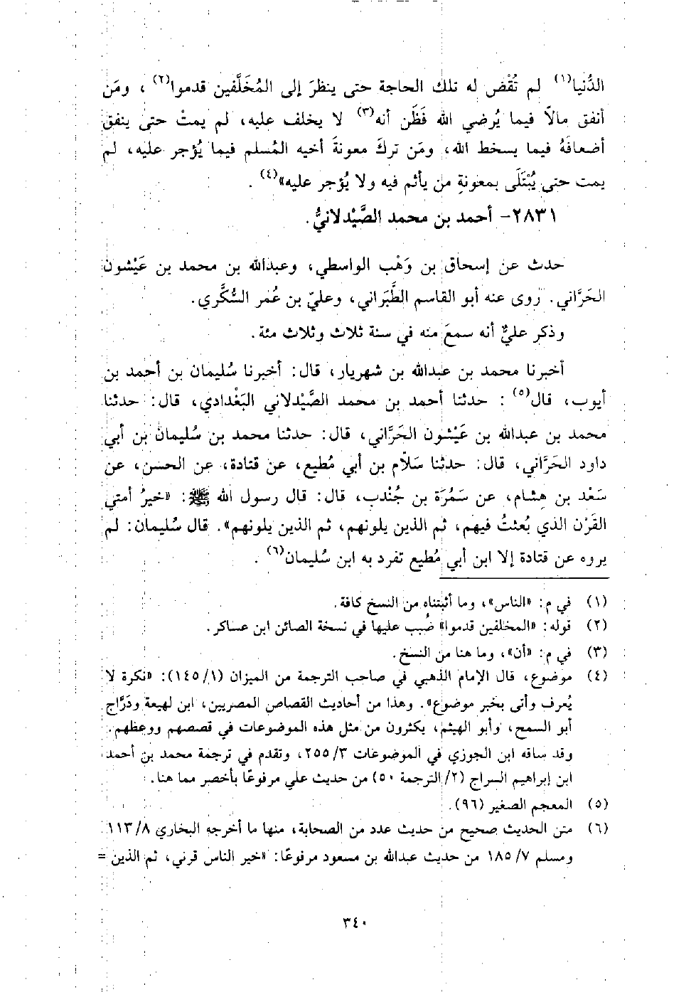 (1790) -[6: 340] أَخْبَرَنَا مُحَمَّدُ بْنُ عَبْدِ اللَّهِ بْنِ شَهْرَيَارَ، قَالَ: حَدَّثَنَا سُلَيْمَانُ بْنُ أَحْمَدَ بْنِ أَيُّوبَ، قَالَ: أَخْبَرَنَا أَحْمَدُ بْنُ مُحَمَّدٍ الصَّيْدَلانِيُّ الْبَغْدَادِيُّ، قَالَ: حَدَّثَنَا مُحَمَّدُ بْنُ عَبْدِ اللَّهِ بْنِ عَيْشُونٍ الْحَرَّانِيُّ، قَالَ: حَدَّثَنَا مُحَمَّدُ بْنُ سُلَيْمَانَ بْنِ أَبِي دَاوُدَ الْحَرَّانِيُّ، قَالَ: حَدَّثَنَا سَلامُ بْنُ أَبِي مُطِيعٍ، عَنْ قَتَادَةَ، عَنِ الْحَسَنِ، عَنْ سَعْدِ بْنِ هِشَامٍ، عَنْ سَمُرَةَ بْنِ جُنْدُبٍ، قَالَ: قَالَ رَسُولُ اللَّهُ صَلَّى اللَّهُ عَلَيْهِ وَسَلَّمَ: " خَيْرُ أُمَّتِي الْقَرْنُ الَّذِي بُعِثْتُ فِيهِمْ، ثُمَّ الَّذِينَ يَلُونَهُمْ، ثُمَّ الَّذِينَ يَلُونَهُمْ " قَالَ سُلَيْمَان: لم يروه عَن قتادة إلا ابْن أَبِي مطيع، تفرد بِهِ ابْن سُلَيْمَان.