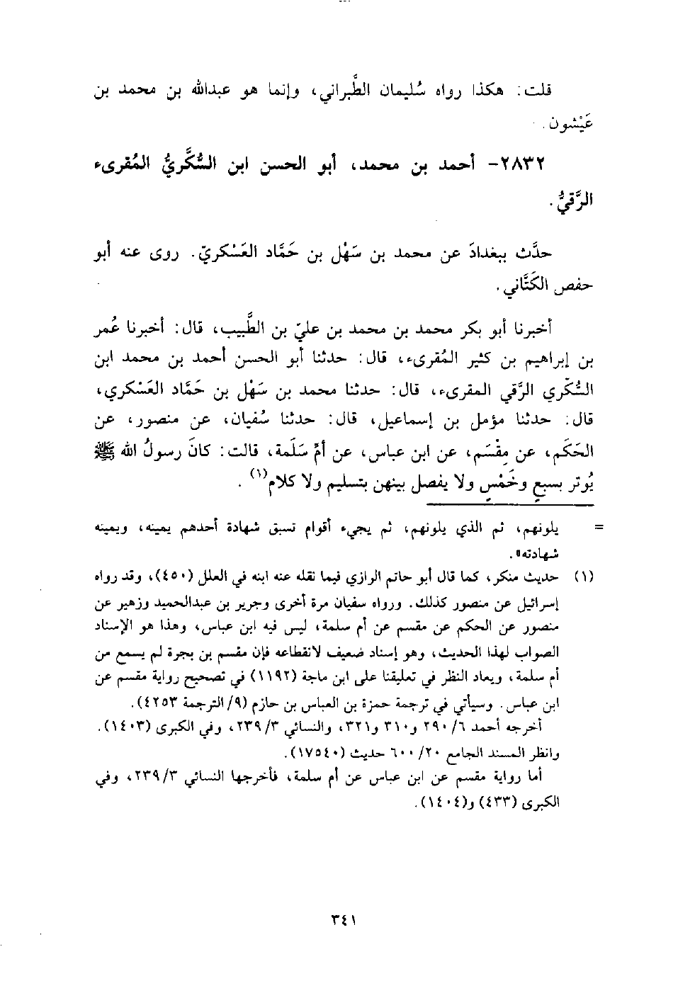 (1791) أَخْبَرَنَا أَبُو بَكْرٍ مُحَمَّدُ بْنُ عَلِيِّ بْنِ الطَّيِّبِ، قَالَ: أَخْبَرَنَا عُمَرُ بْنُ إِبْرَاهِيمَ بْنِ كَثِيرٍ الْمُقْرِئُ، قَالَ: حَدَّثَنَا أَبُو الْحَسَنِ أَحْمَدُ بْنُ مُحَمَّدِ بْنِ السُّكَّرِيِّ الرَّقِّيُّ الْمُقْرِئُ، قَالَ: حَدَّثَنَا مُحَمَّدُ بْنُ سَهْلِ بْنِ حَمَّادٍ الْعَسْكَرِيُّ، قَالَ: حَدَّثَنَا مُؤَمَّلُ بْنُ إِسْمَاعِيلَ، قَالَ: حَدَّثَنَا سُفْيَانُ، عَنْ مَنْصُورٍ، عَنِ الْحَكَمِ، عَنْ مِقْسَمٍ، عَنِ ابْنِ عَبَّاسٍ، عَنْ أُمِّ سَلَمَةَ، قَالَتْ: كَانَ رَسُولُ اللَّهِ صَلَّى اللَّهُ عَلَيْهِ وَسَلَّمَ " يُوتِرُ بِسَبْعٍ وَخَمْسٍ، وَلا يَفْصِلُ بَيْنَهُنَّ بِتَسْلِيمٍ وَلا كَلامٍ "