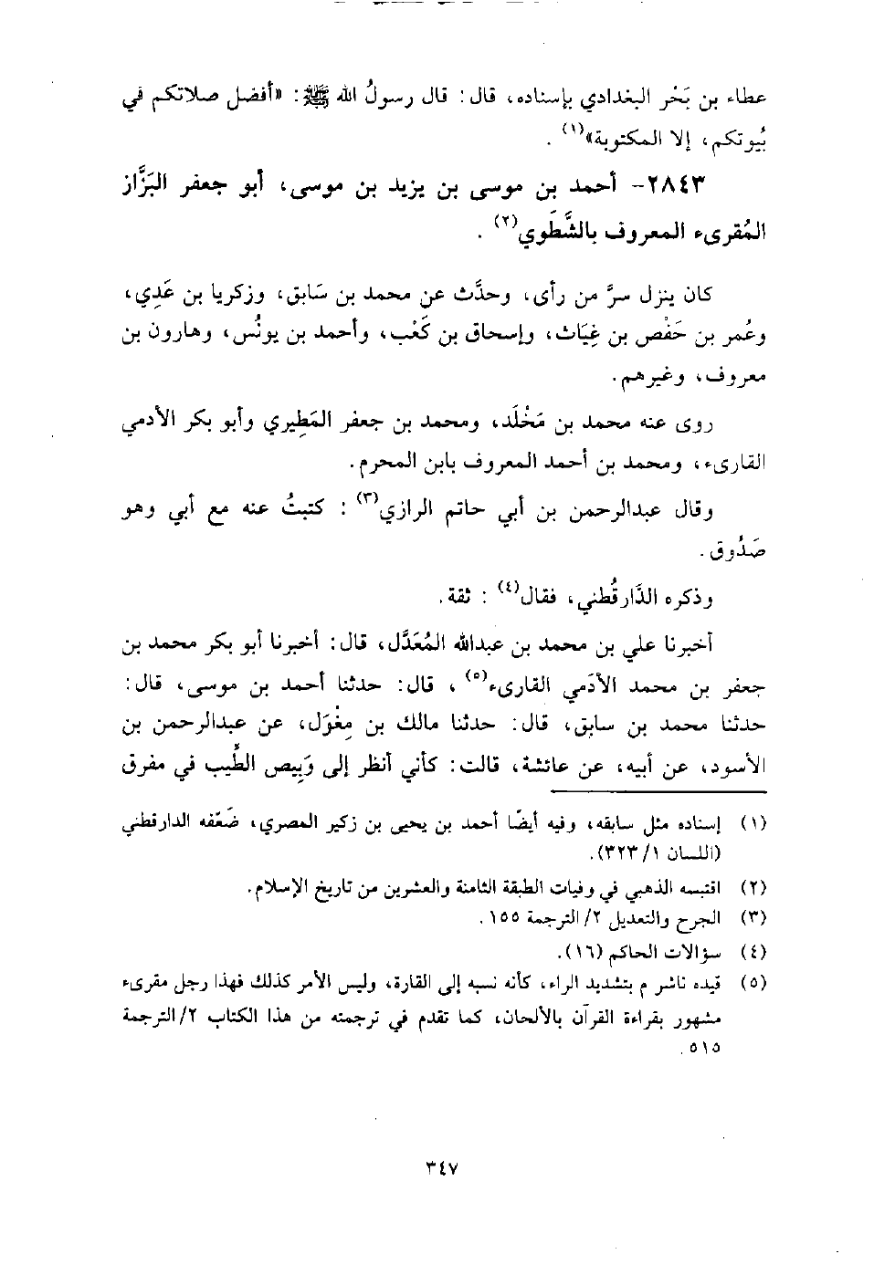2843 - أَحْمَد بْن مُوسَى بْن يزيد بْن مُوسَى أَبُو جَعْفَر البزاز المقرئ المعروف بالشطوي كَانَ ينزل سر من رأى، وحدث عَن مُحَمَّد بْن سابق، وزكريا بْن عدي، وعمر بْن حفص بْن غياث، وإِسْحَاق بْن كعب، وأَحْمَد بْن يونس، وهارون بْن معروف، وغيرهم.
