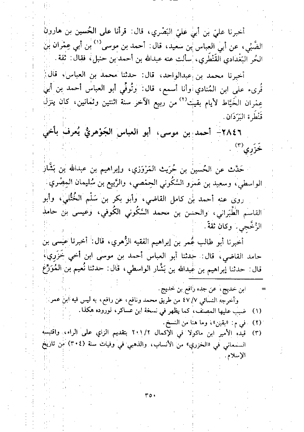2846 - أَحْمَد بْن مُوسَى أَبُو الْعَبَّاس الجوهري يعرف بأخي خزري حدث عَنِ الحسين بْن حريث الْمَرْوَزِيُّ، وإبراهيم بْن عَبْد اللَّهِ بْن بشار الواسطي، وسعيد بْن عمرو السكوني الحمصي، وَالربيع بْن سُلَيْمَان المصري.