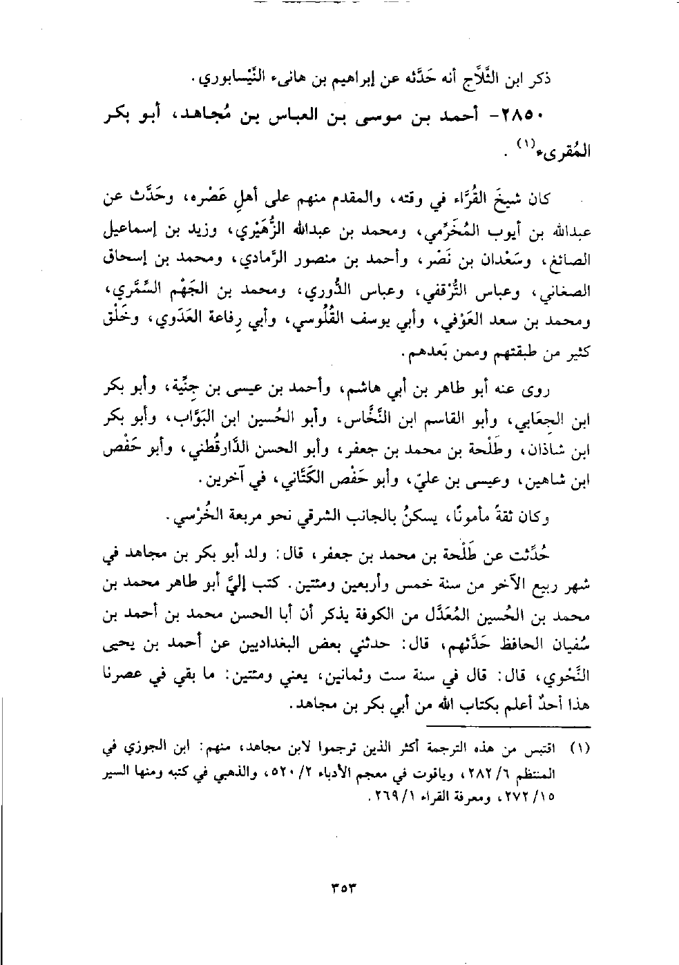 2850 - أَحْمَد بْن مُوسَى بْن الْعَبَّاس بْن مجاهد أَبُو بَكْر المقرئ كَانَ شيخ القراء فِي وقته، وَالمقدم منهم عَلَى أهل عصره، وحدث عَن عَبْد اللَّهِ بْن أيوب المخرمي، ومحمد بْن عَبْد اللَّهِ الزهيري، وزيد بْن إسماعيل الصايغ، وسعدان بْن نصر، وأَحْمَد بْن منصور الرمادي، ومحمد بْن إِسْحَاق الصاغاني، وعباس الترقفِي، وعباس الدوري، ومحمد بْن الجهم السمري، ومحمد بْن العوفِي، وأبي يُوسُف القلوسي، وأبي رفاعة العدوي، وخلق كثير من طبقتهم، وممن بعدهم.