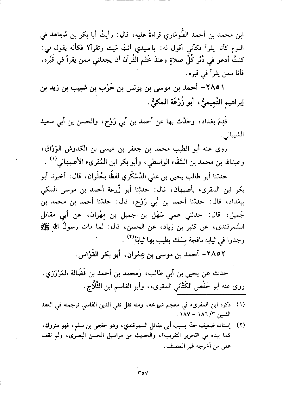 2852 - أَحْمَد بْن مُوسَى بْن عمران أَبُو بَكْر القواس حدث عَن يَحْيَى بْن أَبِي طَالِب، ومحمد بْن أَحْمَد بْن فضالة الْمَرْوَزِيُّ.