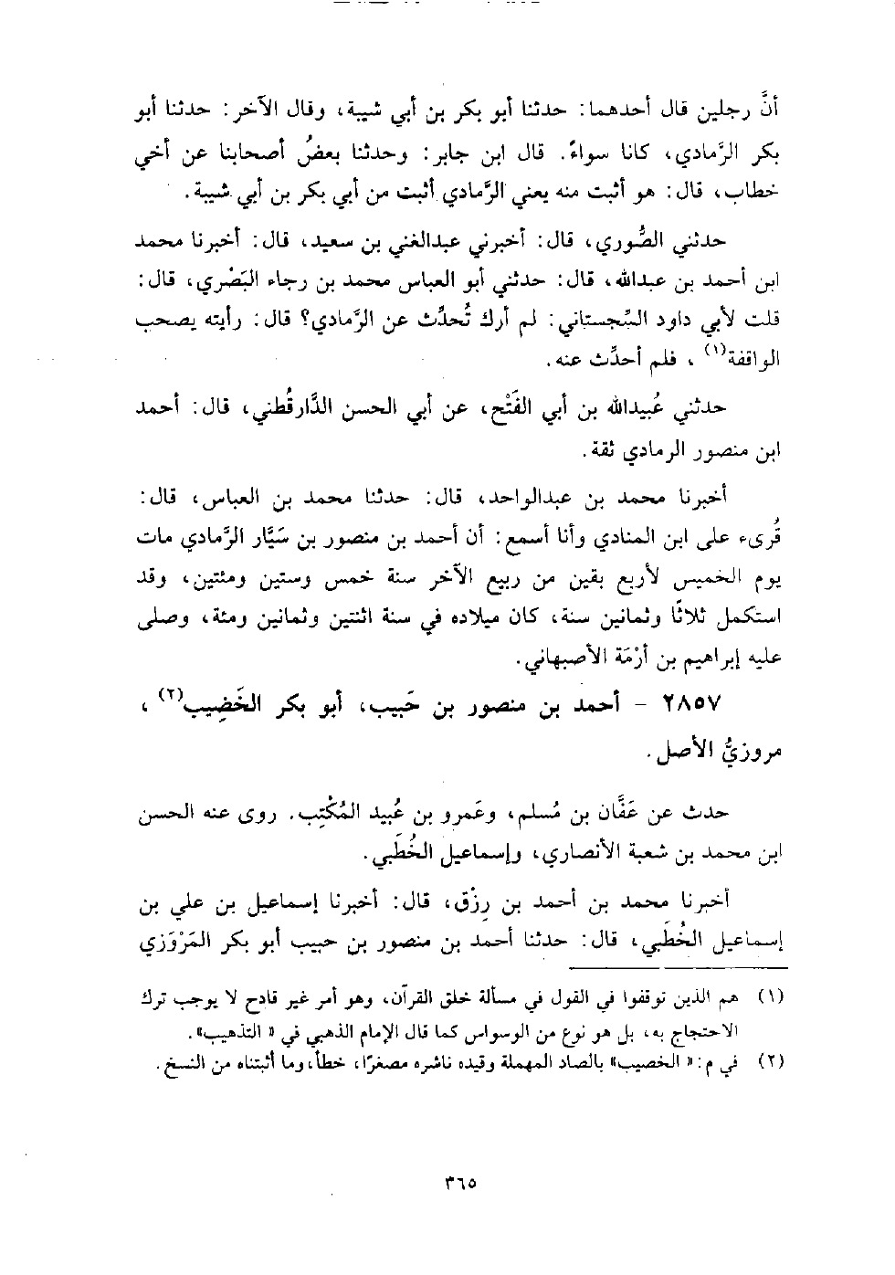 2857 - أَحْمَد بْن منصور بْن حبيب أَبُو بَكْر الخضيب مروزي الأصل حدث عَن عفان بْن مسلم، وعمرو بْن عبيد المكتب، روى عنه الحسن بن محمد بن شعبة الأنصاري، وإسماعيل الخطبي.