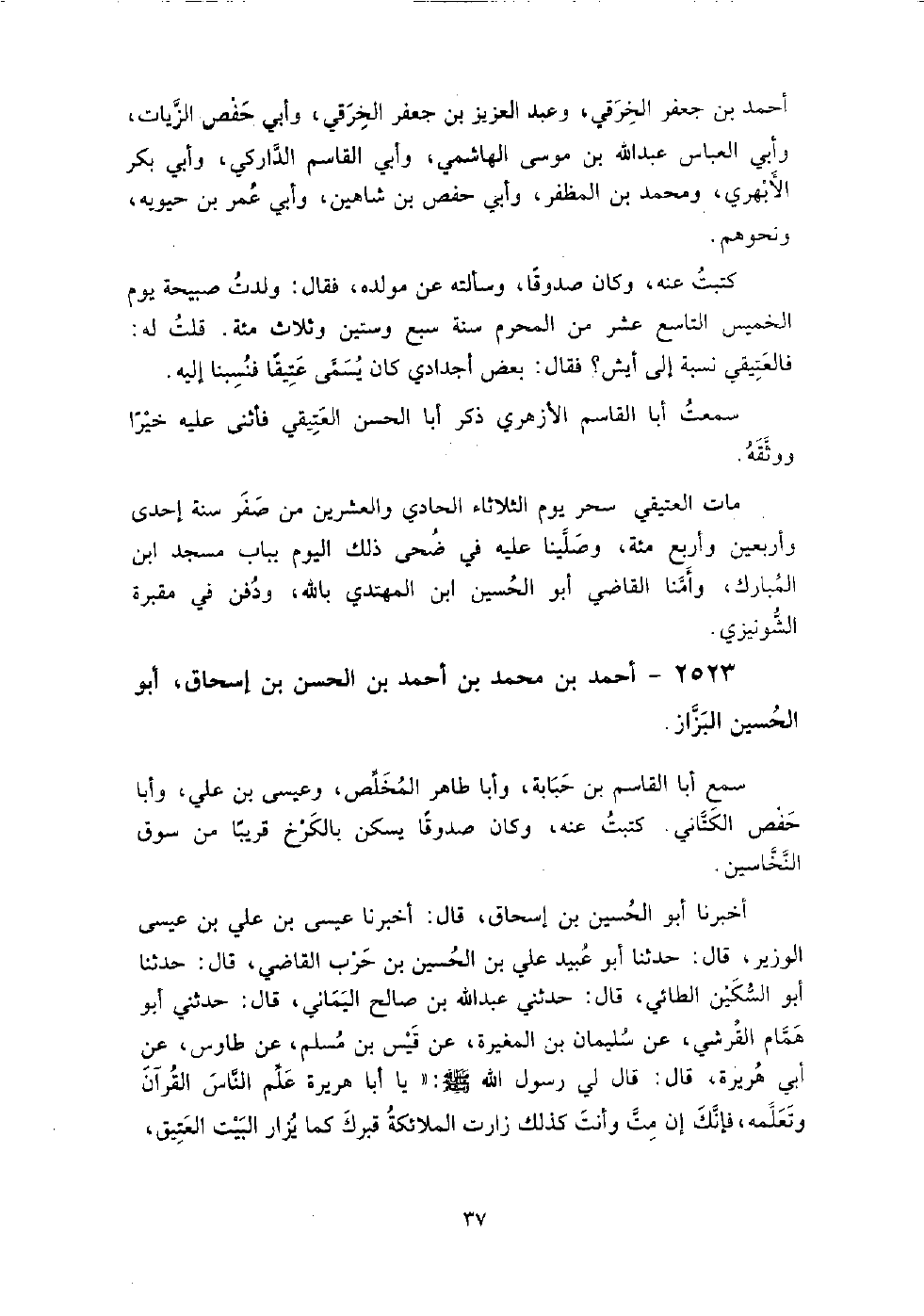 (1614) -[6: 37] أَخْبَرَنَا أَبُو الْحُسَيْنِ بْنُ إِسْحَاقَ، قَالَ: أَخْبَرَنَا عِيسَى بْنُ عَلِيِّ بْنِ عِيسَى الْوَزِيرُ، قَالَ: حدثنا أَبُو عُبَيْدٍ عَلِيُّ بْنُ الْحُسَيْنِ بْنِ حَرْبٍ الْقَاضِي، قَالَ: حَدَّثَنَا أَبُو السِّكِّينِ الطَّائِيُّ، قَالَ: حَدَّثَنِي عَبْدُ اللَّهِ بْنُ صَالِحٍ الْيَمَانِيُّ، قَالَ: حَدَّثَنِي أَبُو هَمَّامٍ الْقُرَشِيُّ، عَنْ سُلَيْمَانَ بْنِ الْمُغِيرَةِ، عَنْ قَيْسِ بْنِ مُسْلِمٍ، عَنْ طَاوُسٍ، عَنْ أَبِي هُرَيْرَةَ، قَالَ: قَالَ لِي رَسُولُ اللَّهِ صَلَّى اللَّهُ عَلَيْهِ وَسَلَّمَ: " يَا أَبَا هُرَيْرَةَ، عَلِّمِ النَّاسَ الْقُرْآنَ، وَتَعَلَّمْهُ فَإِنَّكَ إِنْ مُتَّ وَأَنْتَ كَذَلِكَ زَارَتِ الْمَلائِكَةُ قَبْرَكَ كَمَا يُزَارُ الْبَيْتُ الْعَتِيقُ، وَعَلِّمِ النَّاسَ سُنَّتِي وَإِنْ كَرِهُوا ذَلِكَ وَإِنْ أَحْبَبْتَ أَنْ لا تُوقَفَ عَلَى الصِّرَاطَ طَرْفَةَ عَيْنٍ حَتَّى تَدْخُلَ الْجَنةَ، فَلا تُحْدِثْ فِي دِينِ اللَّهِ حَدَثًا بِرَأْيِكَ " سألته عَن مولده، فقال: في شهر ربيع الأول من سنة اثنتين وسبعين وثلاث مائة ومات في رجب من سنة اثنتين وأربعين وأربع مائة