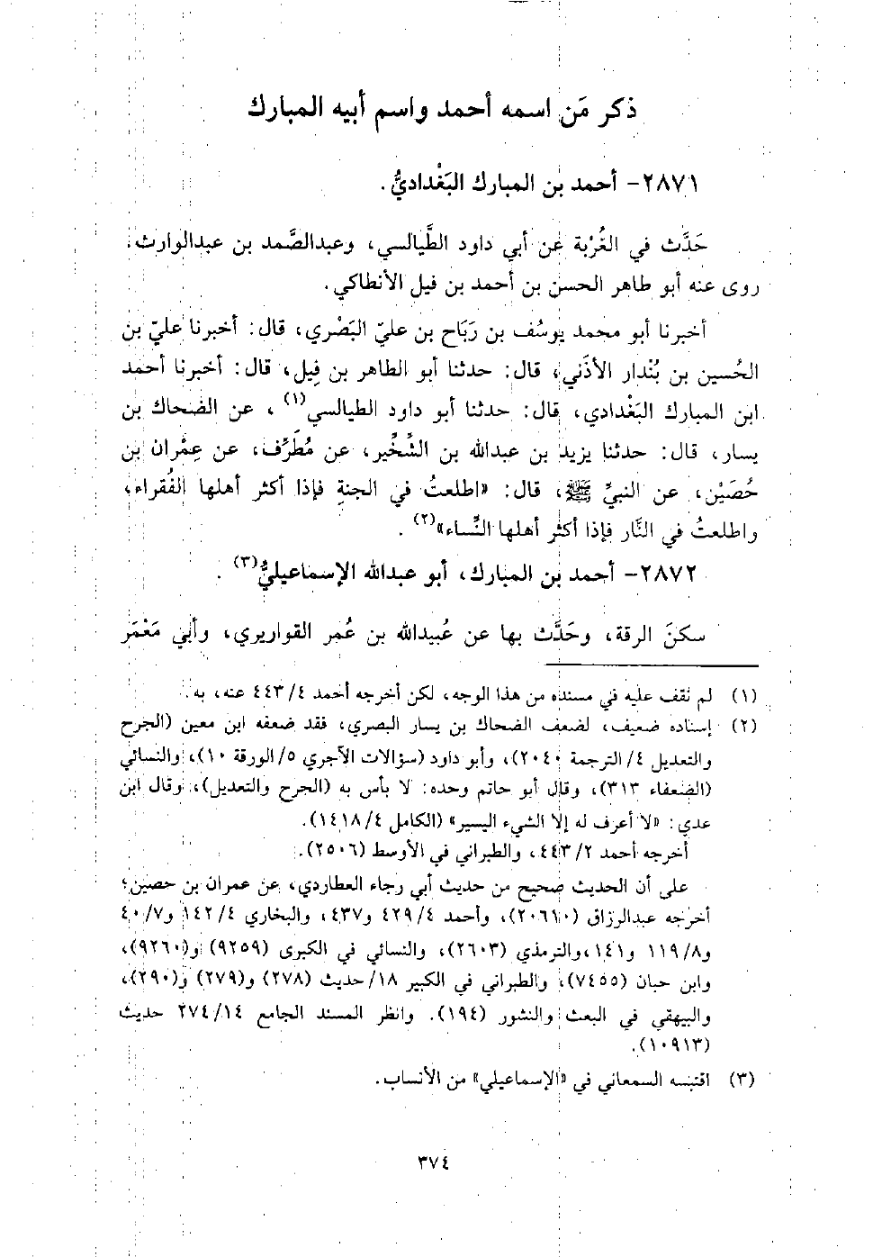2872 - أَحْمَد بْن المبارك أَبُو عَبْد اللَّهِ الإسماعيلي سكن الرقة، وحدث بِهَا عَن عبيد اللَّه بْن عُمَر القواريري، وأبي معمر القطيعي، روى عنه: أَبُو عروبة الحراني، ومحمد بْن عَبْد اللَّهِ المعروف بمكحول البيروتي، وإنما قيل له الإسماعيلي لأنه كَانَ يعتني بجمع حَدِيث إسماعيل بْن أَبِي خالد.