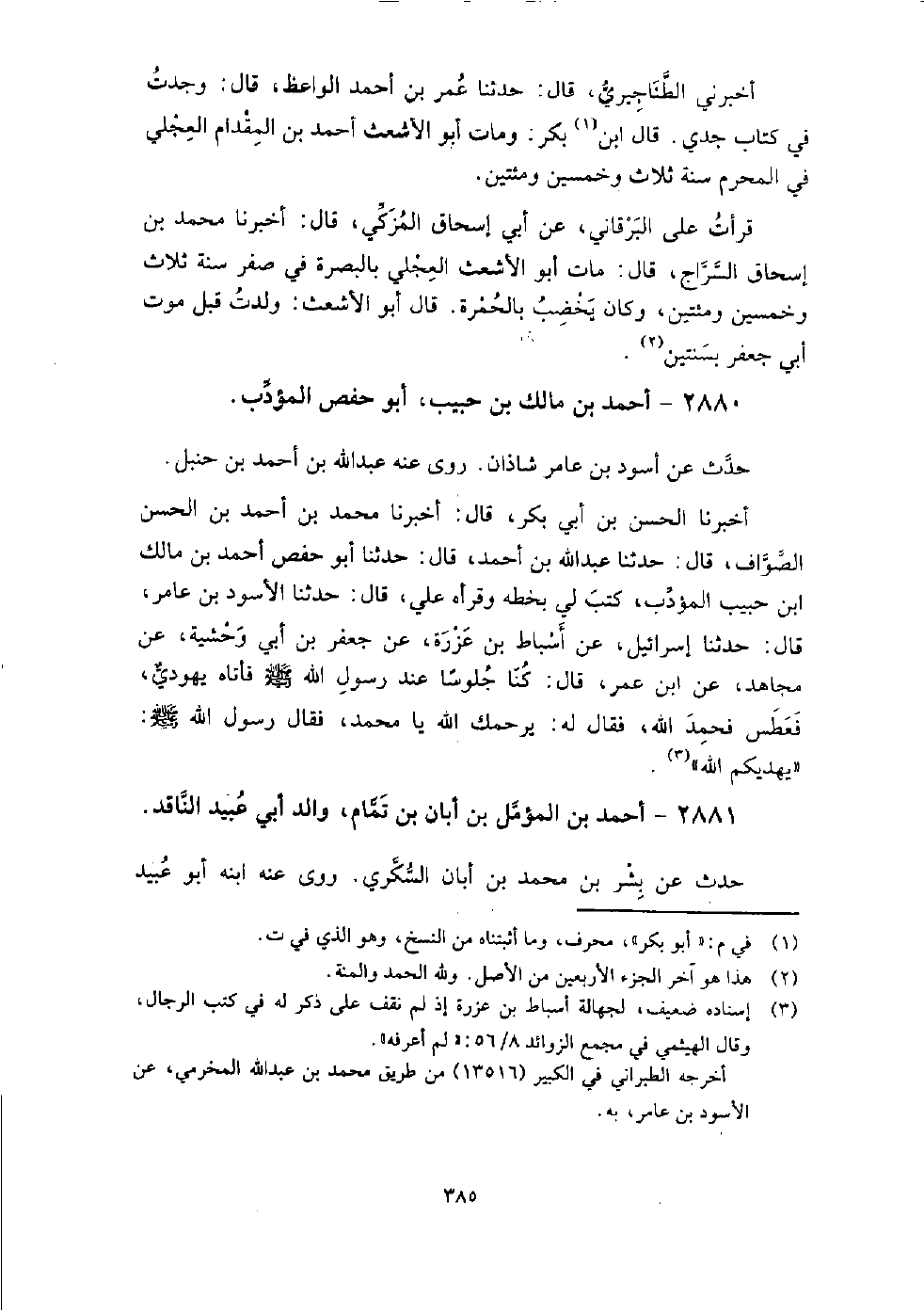 2880 - أَحْمَد بْن مالك بْن حبيب أَبُو حفص المؤدب حدث عَن أسود بْن عامر شاذان، روى عنه عَبْد اللَّهِ بْن أَحْمَد بْن حَنْبَل.