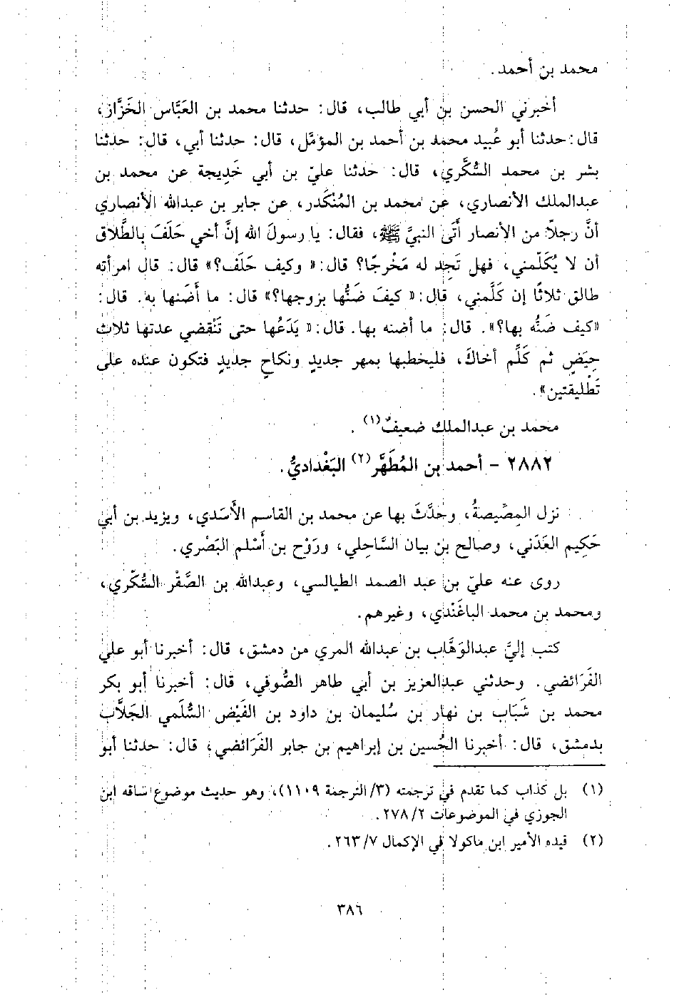 2882 - أَحْمَد بْن المطهر البغدادي نزل المصيصة، وحدث بِهَا عَن مُحَمَّد بْن الْقَاسِم الأسدي، ويزيد بْن أَبِي حكيم العدني، وصَالِح بْن بيان الساحلي، وروح بْن أسلم البصري.
